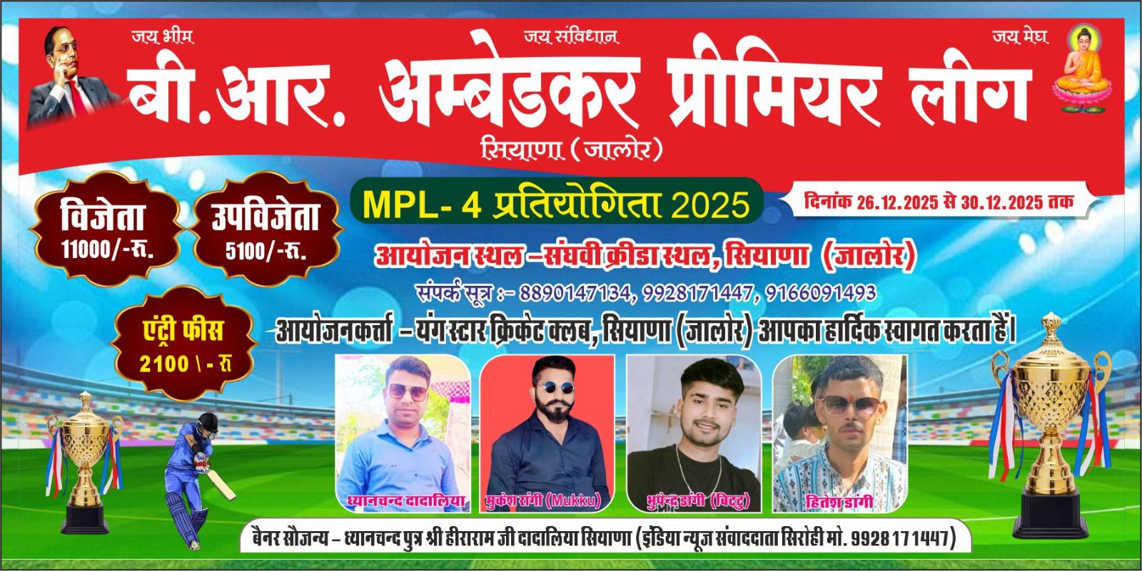 निकटवर्ती सियाणा स्थित संघवी क्रीड़ा स्थल में डॉ. बी. आर. अंबेडकर प्रीमियर लीग क्रिकेट प्रतियोगिता का आज से विधिवत एवं भव्य शुभारंभ हो रहा है। पाँच दिवसीय इस क्रिकेट महाकुंभ को लेकर क्षेत्र के खेलप्रेमियों एवं युवाओं में विशेष उत्साह देखने को मिल रहा है।
