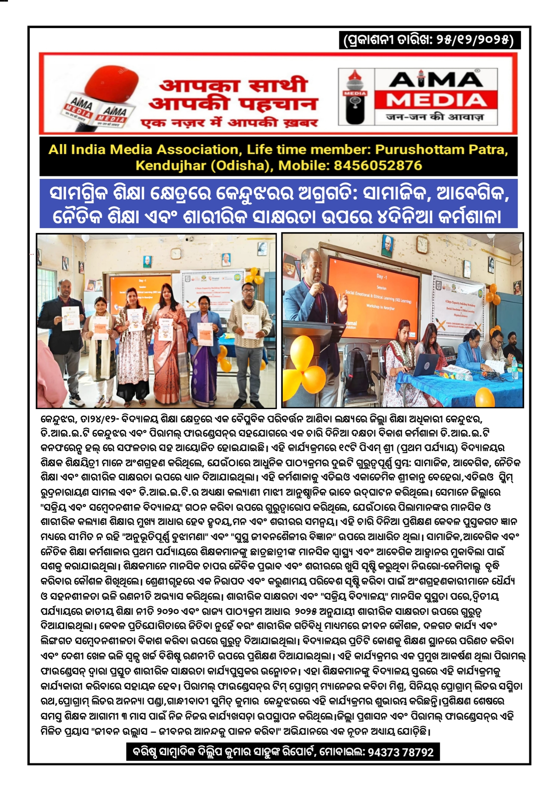 କେନ୍ଦୁଝର, ତା୨୪/୧୨- ବିଦ୍ୟାଳୟ ଶିକ୍ଷା କ୍ଷେତ୍ରରେ ଏକ ବୈପ୍ଳବିକ ପରିବର୍ତ୍ତନ ଆଣିବା ଲକ୍ଷ୍ୟରେ ଜିଲ୍ଲା ଶିକ୍ଷା ଅଧିକାରୀ କେନ୍ଦୁଝର, ଡି.ଆଇ.ଇ.ଟି କେନ୍ଦୁଝର ଏବଂ ପିରାମଲ୍ ଫାଉଣ୍ଡେସନ୍‌ର ସହଯୋଗରେ ଏକ ଚାରି ଦିନିଆ ଦକ୍ଷତା ବିକାଶ କର୍ମଶାଳା ଡି.ଆଇ.ଇ.ଟି କନଫରେନ୍ସ ହଲ୍ ରେ ସଫଳତାର ସହ ଆୟୋଜିତ ହୋଇଯାଇଛି।ଏହି କାର୍ଯ୍ୟକ୍ରମରେ ୧୯ଟି ପିଏମ୍ ଶ୍ରୀ (ପ୍ରଥମ ପର୍ଯ୍ୟାୟ) ବିଦ୍ୟାଳୟର ଶିକ୍ଷକ ଶିକ୍ଷୟିତ୍ରୀ ମାନେ ଅଂଶଗ୍ରହଣ କରିଥିଲେ, ଯେଉଁଠାରେ ଆଧୁନିକ ପାଠ୍ୟକ୍ରମର ଦୁଇଟି ଗୁରୁତ୍ୱପୂର୍ଣ୍ଣ ସ୍ତମ୍ଭ: ସାମାଜିକ, ଆବେଗିକ, ନୈତିକ ଶିକ୍ଷା ଏବଂ ଶାରୀରିକ ସାକ୍ଷରତା ଉପରେ ଧ୍ୟାନ ଦିଆଯାଇଥିଲା।ଏହି କର୍ମଶାଳାକୁ ଏଡିଇଓ ଏକାଡେମିକ ଶ୍ରୀକାନ୍ତ ବେହେରା, ଏଡିଇଓ ସ୍କିମ୍ ରୁଦ୍ରନାରାୟଣ ସାମଲ ଏବଂ ଡି.ଆଇ.ଇ.ଟି.ର ଅଧ୍ୟକ୍ଷା କଲ୍ୟାଣୀ ମାଝୀ ଆନୁଷ୍ଠାନିକ ଭାବେ ଉଦ୍‌ଘାଟନ କରିଥିଲେ।ସେମାନେ ଜିଲ୍ଲାରେ "ସକ୍ରିୟ ଏବଂ ସମ୍ବେଦନଶୀଳ ବିଦ୍ୟାଳୟ" ଗଠନ କରିବା ଉପରେ ଗୁରୁତ୍ୱାରୋପ କରିଥିଲେ, ଯେଉଁଠାରେ ପିଲାମାନଙ୍କର ମାନସିକ ଓ ଶାରୀରିକ କଲ୍ୟାଣ ଶିକ୍ଷାର ମୁଖ୍ୟ ଆଧାର ହେବ ହୃଦୟ, ମନ ଏବଂ ଶରୀରର ସମନ୍ୱୟ ।ଏହି ଚାରି ଦିନିଆ ପ୍ରଶିକ୍ଷଣ କେବଳ ପୁସ୍ତକଗତ ଜ୍ଞାନ ମଧ୍ୟରେ ସୀମିତ ନ ରହି "ଅନୁଭୂତିପୂର୍ଣ୍ଣ ବୁଝାମଣା" ଏବଂ "ସୁସ୍ଥ ଜୀବନଶୈଳୀର ବିଜ୍ଞାନ" ଉପରେ ଆଧାରିତ ଥିଲା।ସାମାଜିକ, ଆବେଗିକ ଏବଂ ନୈତିକ ଶିକ୍ଷା କର୍ମଶାଳାର ପ୍ରଥମ ପର୍ଯ୍ୟାୟରେ ଶିକ୍ଷକମାନଙ୍କୁ ଛାତ୍ରଛାତ୍ରୀଙ୍କ ମାନସିକ ସ୍ବାସ୍ଥ୍ୟ ଏବଂ ଆବେଗିକ ଆହ୍ୱାନର ମୁକାବିଲା ପାଇଁ ସଶକ୍ତ କରାଯାଇଥିଲା।ଶିକ୍ଷକମାନେ ମାନସିକ ଚାପର ଜୈବିକ ପ୍ରଭାବ ଏବଂ ଶରୀରରେ ଖୁସି ସୃଷ୍ଟି କରୁଥିବା ନିଉରୋ-କେମିକାଲ୍ସ ବୃଦ୍ଧି କରିବାର କୌଶଳ ଶିଖିଥିଲେ। ଶ୍ରେଣୀଗୃହରେ ଏକ ନିରାପଦ ଏବଂ କରୁଣାମୟ ପରିବେଶ ସୃଷ୍ଟି କରିବା ପାଇଁ ଅଂଶଗ୍ରହଣକାରୀ ମାନେ ଧୈର୍ଯ୍ୟ ଓ ସହନଶୀଳତା ଭଳି ରଣନୀତି ଅଭ୍ୟାସ କରିଥିଲେ।ଶାରୀରିକ ସାକ୍ଷରତା ଏବଂ "ସକ୍ରିୟ ବିଦ୍ୟାଳୟ" ମାନସିକ ସୁସ୍ଥତା ପରେ, ଦ୍ୱିତୀୟ ପର୍ଯ୍ୟାୟରେ ଜାତୀୟ ଶିକ୍ଷା ନୀତି ୨୦୨୦ ଏବଂ ରାଜ୍ୟ ପାଠ୍ୟକ୍ରମ ଆଧାର ୨୦୨୫ ଅନୁଯାୟୀ ଶାରୀରିକ ସାକ୍ଷରତା ଉପରେ ଗୁରୁତ୍ୱ ଦିଆଯାଇଥିଲା। କେବଳ ପ୍ରତିଯୋଗିତାରେ ଜିତିବା ନୁହେଁ ବରଂ ଶାରୀରିକ ଗତିବିଧି ମାଧ୍ୟମରେ ଜୀବନ କୌଶଳ, ଦଳଗତ କାର୍ଯ୍ୟ ଏବଂ ଲିଙ୍ଗଗତ ସମ୍ବେଦନଶୀଳତା ବିକାଶ କରିବା ଉପରେ ଗୁରୁତ୍ୱ ଦିଆଯାଇଥିଲା। ବିଦ୍ୟାଳୟର ପ୍ରତିଟି କୋଣକୁ ଶିକ୍ଷଣ ସ୍ଥାନରେ ପରିଣତ କରିବା ଏବଂ ଦେଶୀ ଖେଳ ଭଳି ସ୍ୱଳ୍ପ ଖର୍ଚ୍ଚ ବିଶିଷ୍ଟ ରଣନୀତି ଉପରେ ପ୍ରଶିକ୍ଷଣ ଦିଆଯାଇଥିଲା। ଏହି କାର୍ଯ୍ୟକ୍ରମର ଏକ ପ୍ରମୁଖ ଆକର୍ଷଣ ଥିଲା ପିରାମଲ୍ ଫାଉଣ୍ଡେସନ୍ ଦ୍ୱାରା ପ୍ରସ୍ତୁତ ଶାରୀରିକ ସାକ୍ଷରତା କାର୍ଯ୍ୟପୁସ୍ତକର ଉନ୍ମୋଚନ। ଏହା ଶିକ୍ଷକମାନଙ୍କୁ ବିଦ୍ୟାଳୟ ସ୍ତରରେ ଏହି କାର୍ଯ୍ୟକ୍ରମକୁ କାର୍ଯ୍ୟକାରୀ କରିବାରେ ସହାୟକ ହେବ। ପିରାମଲ୍ ଫାଉଣ୍ଡେସନ୍‌ର ଟିମ୍ ପ୍ରୋଗ୍ରମ୍ ମ୍ୟାନେଜର କବିତା ମିଶ୍ର, ସିନିୟର୍ ପ୍ରୋଗ୍ରାମ୍ ଲିଡର ସସ୍ମିତା ରଥ, ପ୍ରୋଗ୍ରାମ୍ ଲିଡର ଅନନ୍ୟା ପଣ୍ଡା, ଗାନ୍ଧୀବାଦୀ ସୁମିତ୍ କୁମାର କେନ୍ଦୁଝରରେ ଏହି କାର୍ଯ୍ୟକ୍ରମର ଶୁଭାରମ୍ଭ କରିଛନ୍ତି। ପ୍ରଶିକ୍ଷଣ ଶେଷରେ ସମସ୍ତ ଶିକ୍ଷ