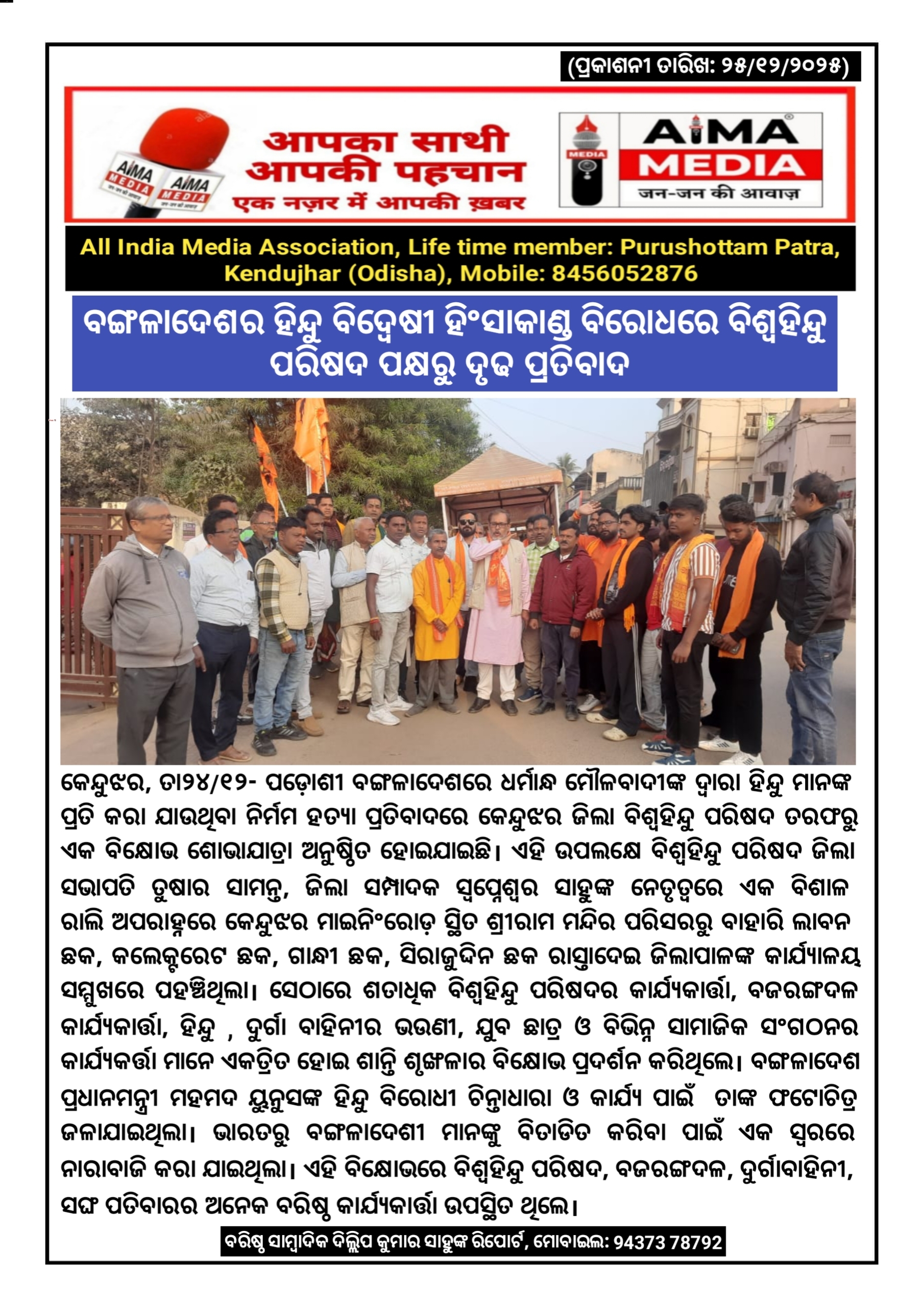 କେନ୍ଦୁଝର, ତା୨୪/୧୨- ପଡ଼ୋଶୀ ବଙ୍ଗଳାଦେଶରେ ଧର୍ମାନ୍ଧ ମୌଳବାଦୀଙ୍କ ଦ୍ଵାରା ହିନ୍ଦୁ ମାନଙ୍କ ପ୍ରତି କରା ଯାଉଥିବା ନିର୍ମମ ହତ୍ୟା ପ୍ରତିବାଦରେ କେନ୍ଦୁଝର ଜିଲା ବିଶ୍ୱହିନ୍ଦୁ ପରିଷଦ ତରଫରୁ ଏକ ବିକ୍ଷୋଭ ଶୋଭାଯାତ୍ରା ଅନୁଷ୍ଠିତ ହୋଇଯାଇଛି। ଏହି ଉପଲକ୍ଷେ ବିଶ୍ୱହିନ୍ଦୁ ପରିଷଦ ଜିଲା ସଭାପତି ତୁଷାର ସାମନ୍ତ, ଜିଲା ସମ୍ପାଦକ ସ୍ବପ୍ନେଶ୍ୱର ସାହୁଙ୍କ ନେତୃତ୍ୱରେ ଏକ ବିଶାଳ ରାଲି ଅପରାହ୍ନରେ କେନ୍ଦୁଝର ମାଇନିଂରୋଡ଼ ସ୍ଥିତ ଶ୍ରୀରାମ ମନ୍ଦିର ପରିସରରୁ ବାହାରି ଲାବନ ଛକ, କଲେକ୍ଟରେଟ ଛକ, ଗାନ୍ଧୀ ଛକ, ସିରାଜୁଦ୍ଦିନ ଛକ ରାସ୍ତାଦେଇ ଜିଲାପାଳଙ୍କ କାର୍ଯ୍ୟାଳୟ ସମ୍ମୁଖରେ ପହଞ୍ଚିଥିଲା। ସେଠାରେ ଶତାଧିକ ବିଶ୍ୱହିନ୍ଦୁ ପରିଷଦର କାର୍ଯ୍ୟକାର୍ତ୍ତା, ବଜରଙ୍ଗଦଳ କାର୍ଯ୍ୟକାର୍ତ୍ତା, ହିନ୍ଦୁ , ଦୁର୍ଗା ବାହିନୀର ଭଉଣୀ, ଯୁବ ଛାତ୍ର ଓ ବିଭିନ୍ନ ସାମାଜିକ ସଂଗଠନର କାର୍ଯ୍ୟକର୍ତ୍ତା ମାନେ ଏକତ୍ରିତ ହୋଇ ଶାନ୍ତି ଶୃଙ୍ଖଳାର ବିକ୍ଷୋଭ ପ୍ରଦର୍ଶନ କରିଥିଲେ। ବଙ୍ଗଳାଦେଶ ପ୍ରଧାନମନ୍ତ୍ରୀ ମହମଦ ୟୁନୁସଙ୍କ ହିନ୍ଦୁ ବିରୋଧୀ ଚିନ୍ତାଧାରା ଓ କାର୍ଯ୍ୟ ପାଇଁ ତାଙ୍କ ଫଟୋଚିତ୍ର ଜଳାଯାଇଥିଲା। ଭାରତରୁ ବଙ୍ଗଳାଦେଶୀ ମାନଙ୍କୁ ବିତାଡିତ କରିବା ପାଇଁ ଏକ ସ୍ୱରରେ ନାରାବାଜି କରା ଯାଇଥିଲା। ଏହି ବିକ୍ଷୋଭରେ ବିଶ୍ୱହିନ୍ଦୁ ପରିଷଦ, ବଜରଙ୍ଗଦଳ, ଦୁର୍ଗାବାହିନୀ, ସଙ୍ଘ ପତିବାରର ଅନେକ ବରିଷ୍ଠ କାର୍ଯ୍ୟକାର୍ତ୍ତା ଉପସ୍ଥିତ ଥିଲେ।
