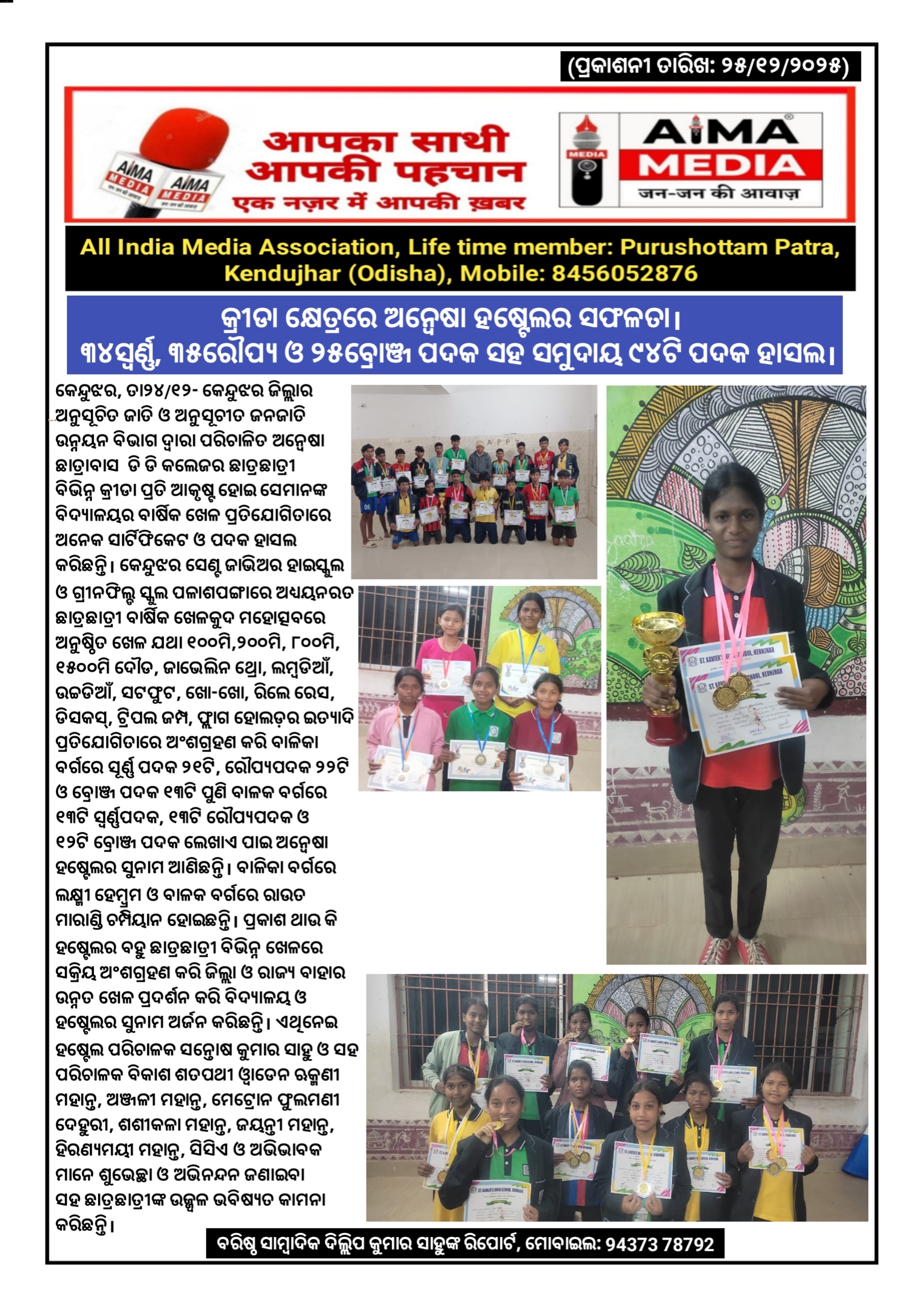 କ୍ରୀଡା କ୍ଷେତ୍ରରେ ଅନ୍ଵେଷା ହଷ୍ଟେଲର ସଫଳତା। ୩୪ସ୍ଵର୍ଣ୍ଣ, ୩୫ରୌପ୍ୟ ଓ ୨୫ବ୍ରୋଞ୍ଜ ପଦକ ସହ ସମୁଦାୟ ୯୪ଟି ପଦକ ହାସଲ।