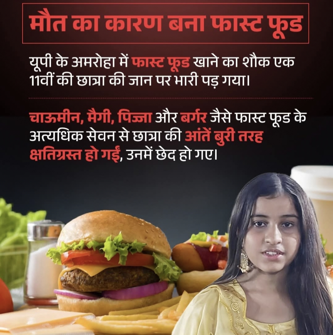 फास्ट फूड का अत्यधिक सेवन एक 11वीं कक्षा की छात्रा के लिए जानलेवा साबित हुआ। चाऊमीन, मैगी, पिज्जा और बर्गर जैसे जंक फूड लगातार खाने से छात्रा की आंतें बुरी तरह खराब हो गईं और उनमें छेद हो गए।