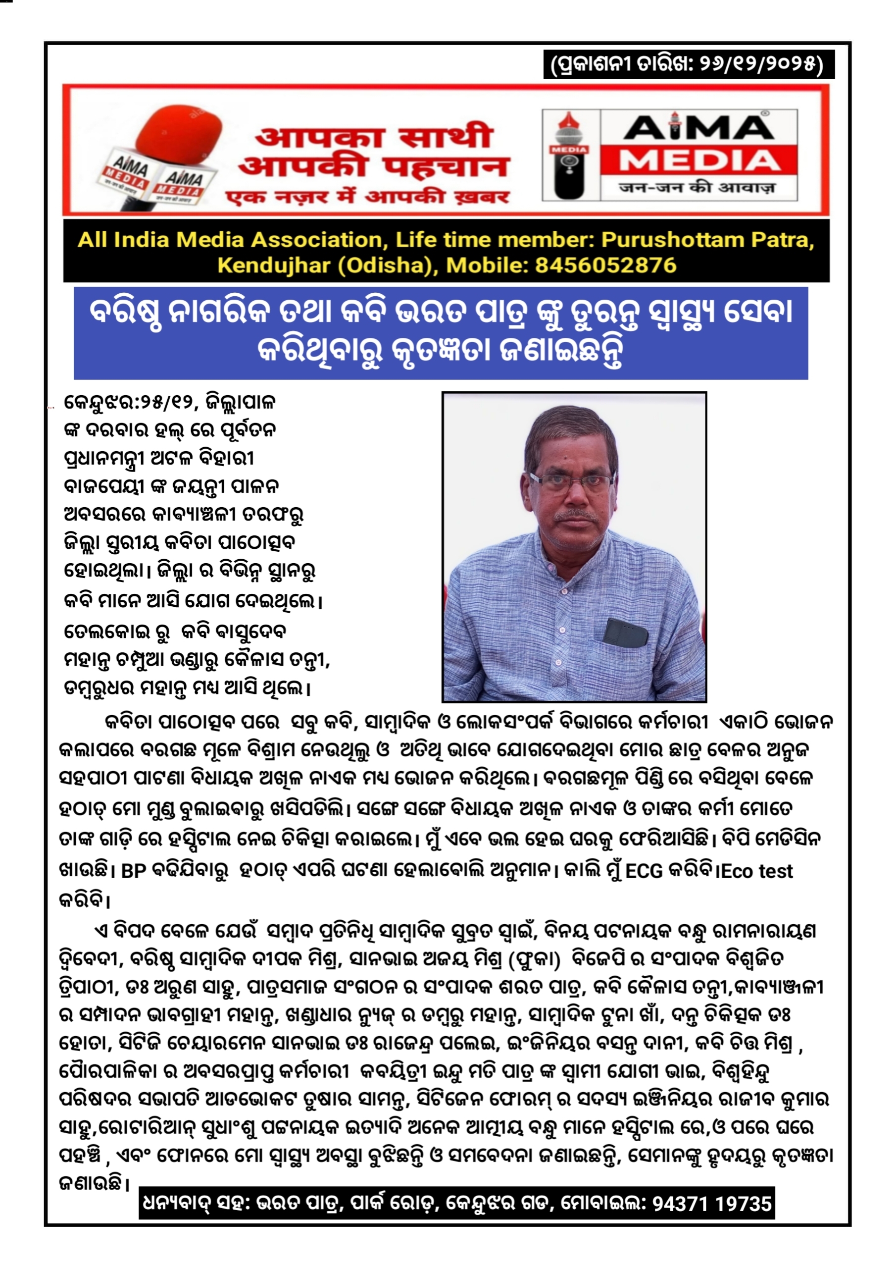 ବରିଷ୍ଠ ନାଗରିକ ତଥା କବି ଭରତ ପାତ୍ର ଙ୍କୁ ତୁରନ୍ତ ସ୍ବାସ୍ଥ୍ଯ ସେବା କରିଥିବାରୁ କୃତଜ୍ଞତା ଜଣାଇଛନ୍ତି।