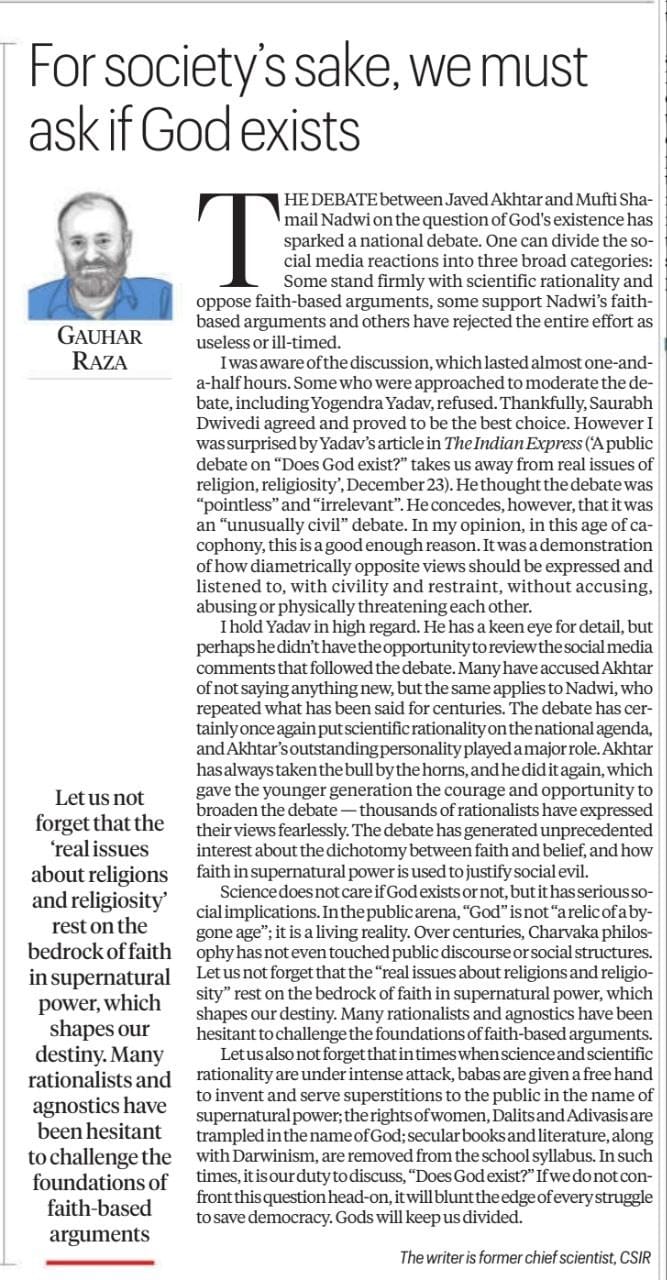 जवळजवळ दीड तास चाललेल्या चर्चेची मला जाणीव होती. योगेंद्र यादव यांच्यासह काहींनी वादविवादाचे नियंत्रण करण्यासाठी नकार दिला. सुदैवाने, सौरभ द्विवेदी यांनी सहमती दर्शवली आणि ते सर्वोत्तम पर्याय असल्याचे सिद्ध झाले. तथापि, यादव यांच्या द इंडियन एक्सप्रेसमधील लेखाने मला आश्चर्य वाटले ('"देव अस्तित्वात आहे का?" यावरील सार्वजनिक चर्चा आपल्याला धर्म, धार्मिकतेच्या वास्तविक मुद्द्यांपासून दूर नेते, २३ डिसेंबर). त्यांना वाटले की ही चर्चा "निरर्थक" आणि "असंबद्ध" होती. तथापि, ते मान्य करतात की ही एक "असामान्यपणे नागरी" वादविवाद होती. माझ्या मते, या गोंधळाच्या युगात, हे पुरेसे कारण आहे. एकमेकांवर आरोप, शिवीगाळ किंवा शारीरिक धमकी न देता, सभ्यता आणि संयमाने, पूर्णपणे विरुद्ध विचार कसे व्यक्त केले पाहिजेत आणि ऐकले पाहिजेत याचे ते एक प्रदर्शन होते.