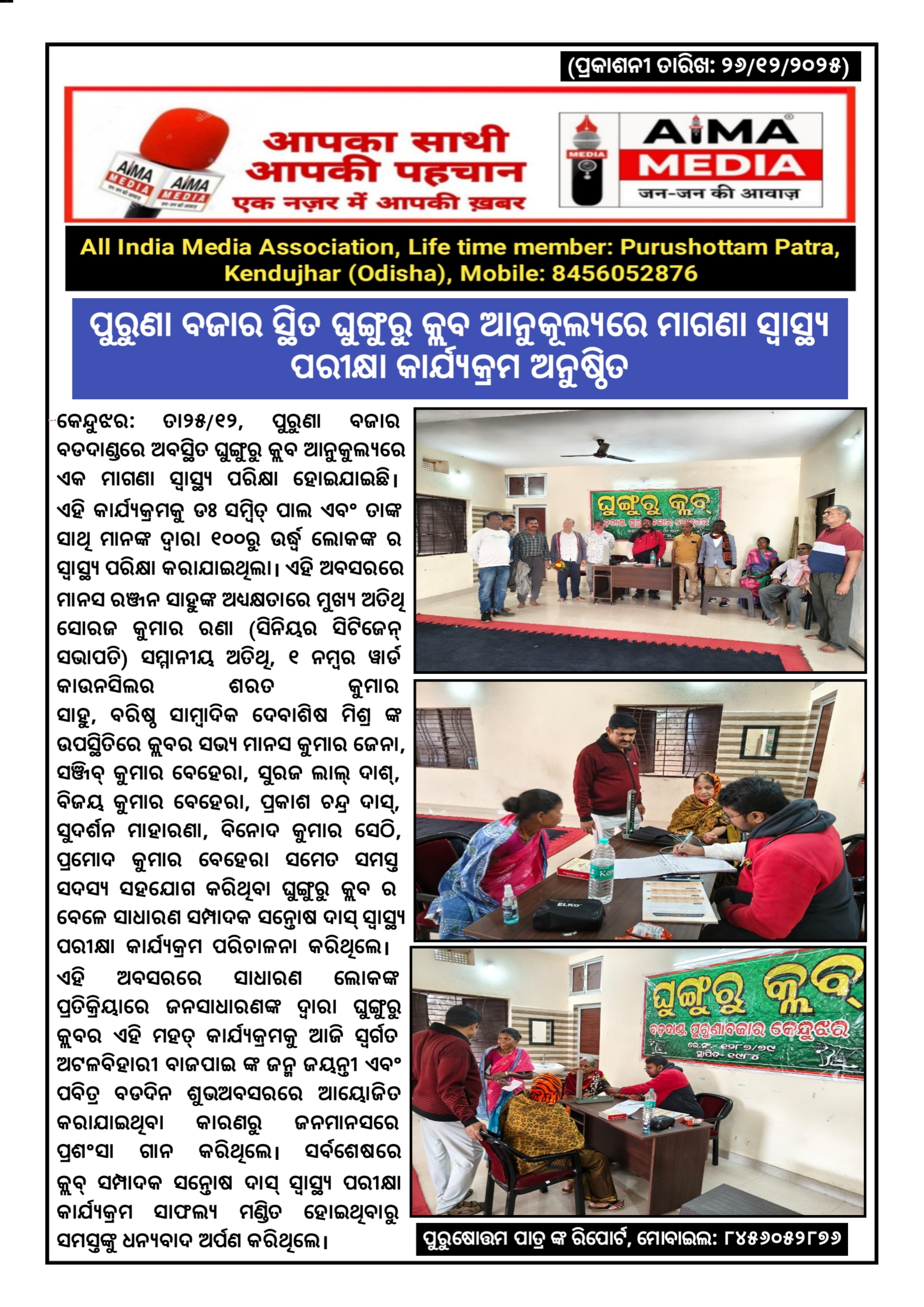 ପୁରୁଣା ବଜାର ସ୍ଥିତ ଘୁଙ୍ଗୁରୁ କ୍ଲବ ଆନୁକୂଲ୍ୟରେ ମାଗଣା ସ୍ବାସ୍ଥ୍ଯ ପରୀକ୍ଷା କାର୍ଯ୍ୟକ୍ରମ ଅନୁଷ୍ଠିତ।