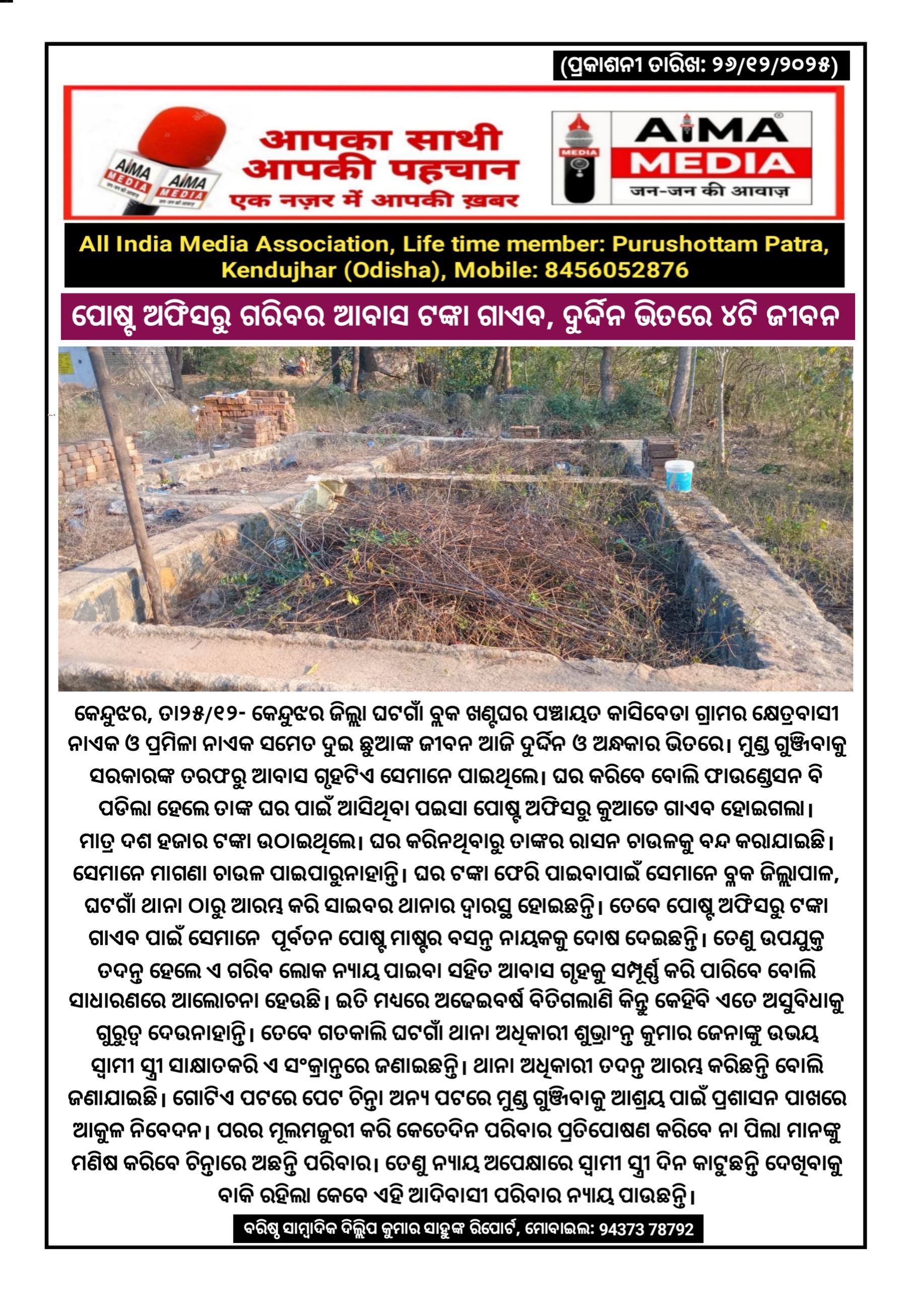 ପୋଷ୍ଟ ଅଫିସରୁ ଗରିବର ଆବାସ ଟଙ୍କା ଗାଏବ, ଦୁର୍ଦ୍ଦିନ ଭିତରେ ୪ଟି ଜୀବନ। କେନ୍ଦୁଝର,ତା୨୫/୧୨- କେନ୍ଦୁଝର ଜିଲ୍ଲା ଘଟଗାଁ ବ୍ଲକ ଖଣ୍ଟଘର ପଞ୍ଚାୟତ କାସିବେଡା ଗ୍ରାମର କ୍ଷେତ୍ରବାସୀ ନାଏକ ଓ ପ୍ରମିଳା ନାଏକ ସମେତ ଦୁଇ ଛୁଆଙ୍କ ଜୀବନ ଆଜି ଦୁର୍ଦ୍ଦିନ ଓ ଅନ୍ଧକାର ଭିତରେ। ମୁଣ୍ଡ ଗୁଞ୍ଜିବାକୁ ସରକାରଙ୍କ ତରଫରୁ ଆବାସ ଗୃହଟିଏ ସେମାନେ ପାଇଥିଲେ l ଘର କରିବେ ବୋଲି ଫାଉଣ୍ଡେସନ ବି ପଡିଲା ହେଲେ ତାଙ୍କ ଘର ପାଇଁ ଆସିଥିବା ପଇସା ପୋଷ୍ଟ ଅଫିସରୁ କୁଆଡେ ଗାଏବ ହୋଇଗଲା। ମାତ୍ର ଦଶ ହଜାର ଟଙ୍କା ଉଠାଇଥିଲେ। ଘର କରିନଥିବାରୁ ତାଙ୍କର ରାସନ ଚାଉଳକୁ ବନ୍ଦ କରାଯାଇଛି। ସେମାନେ ମାଗଣା ଚାଉଳ ପାଇପାରୁନାହାନ୍ତି। ଘର ଟଙ୍କା ଫେରି ପାଇବାପାଇଁ ସେମାନେ ବ୍ଳକ ଜିଲ୍ଲାପାଳ,ଘଟଗାଁ ଥାନା ଠାରୁ ଆରମ୍ଭ କରି ସାଇବର ଥାନାର ଦ୍ୱାରସ୍ଥ ହୋଇଛନ୍ତି। ତେବେ ପୋଷ୍ଟ ଅଫିସରୁ ଟଙ୍କା ଗାଏବ ପାଇଁ ସେମାନେ ପୂର୍ବତନ ପୋଷ୍ଟ ମାଷ୍ଟର ବସନ୍ତ ନାୟକକୁ ଦୋଷ ଦେଇଛନ୍ତି। ତେଣୁ ଉପଯୁକ୍ତ ତଦନ୍ତ ହେଲେ ଏ ଗରିବ ଲୋକ ନ୍ୟାୟ ପାଇବା ସହିତ ଆବାସ ଗୃହକୁ ସମ୍ପୂର୍ଣ୍ଣ କରି ପାରିବେ ବୋଲି ସାଧାରଣରେ ଆଲୋଚନା ହେଉଛି। ଇତି ମଧ୍ୟରେ ଅଢେଇବର୍ଷ ବିତିଗଲାଣି କିନ୍ତୁ କେହିବି ଏତେ ଅସୁବିଧାକୁ ଗୁରୁତ୍ଵ ଦେଉନାହାନ୍ତି। ତେବେ ଗତକାଲି ଘଟଗାଁ ଥାନା ଅଧିକାରୀ ଶୁଭ୍ରାଂନ୍ତ କୁମାର ଜେନାଙ୍କୁ ଉଭୟ ସ୍ଵାମୀ ସ୍ତ୍ରୀ ସାକ୍ଷାତକରି ଏ ସଂକ୍ରାନ୍ତରେ ଜଣାଇଛନ୍ତି। ଥାନା ଅଧିକାରୀ ତଦନ୍ତ ଆରମ୍ଭ କରିଛନ୍ତି ବୋଲି ଜଣାଯାଇଛି। ଗୋଟିଏ ପଟରେ ପେଟ ଚିନ୍ତା ଅନ୍ୟ ପଟରେ ମୁଣ୍ଡ ଗୁଞ୍ଜିବାକୁ ଆଶ୍ରୟ ପାଇଁ ପ୍ରଶାସନ ପାଖରେ ଆକୁଳ ନିବେଦନ । ପରର ମୂଲମଜୁରୀ କରି କେତେଦିନ ପରିବାର ପ୍ରତିପୋଷଣ କରିବେ ନା ପିଲା ମାନଙ୍କୁ ମଣିଷ କରିବେ ଚିନ୍ତାରେ ଅଛନ୍ତି ପରିବାର l ତେଣୁ ନ୍ୟାୟ ଅପେକ୍ଷାରେ ସ୍ଵାମୀ ସ୍ତ୍ରୀ ଦିନ କାଟୁଛନ୍ତି ଦେଖିବାକୁ ବାକି ରହିଲା କେବେ ଏହି ଆଦିବାସୀ ପରିବାର ନ୍ୟାୟ ପାଉଛନ୍ତି।ବରିଷ୍ଠ ସାମ୍ବାଦିକ ଦିଲ୍ଲିପ କୁମାର ସାହୁଙ୍କ ରିପୋର୍ଟ।