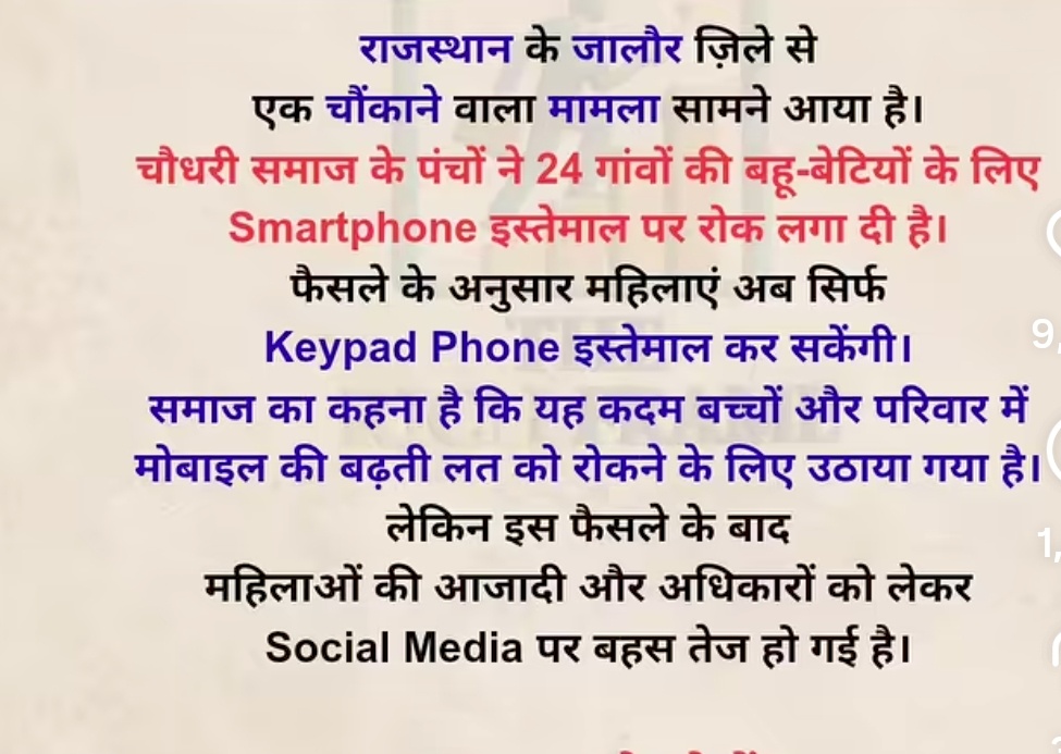 ସମାଜ ପ୍ରଭାଵକୁ ଦୣଷ୍ଟି ରେ ରଖି ରାଜସ୍ଥାନରେ ମହିଳା ମାନଙ୍କର ଅଧିକାର ଓ ସ୍ମାର୍ଟ ଫୋନ୍ ର ବ୍ୟବହାର କୁ ନେଇ କିପେଡ୍ ଫୋନ କେବଳ ବ୍ୟବହାର କରିପାରିବେ ଏହି ନିଷ୍ପତ୍ତି ନିଆଯାଇଛି। କାରଣ ସମାଜର କହିବା ଉଦେଶ୍ୟ ଏହା ଯେ ଅଧିକା ସ୍ମାର୍ଟ ଫୋନ୍ ର ବ୍ୟବହାର ଯେ।ଗୁଂ ପିଲାମାନଙ୍କର ପ୍ରଭାବ ପଡୁଛି ତେଣୁ ରାଜସ୍ଥାନରେ ଏହି ଭଳି ପଦକ୍ଷେପ ସ୍ତାନୀୟ ଲୋକମାନେ ନେଇଛନ୍ତି।