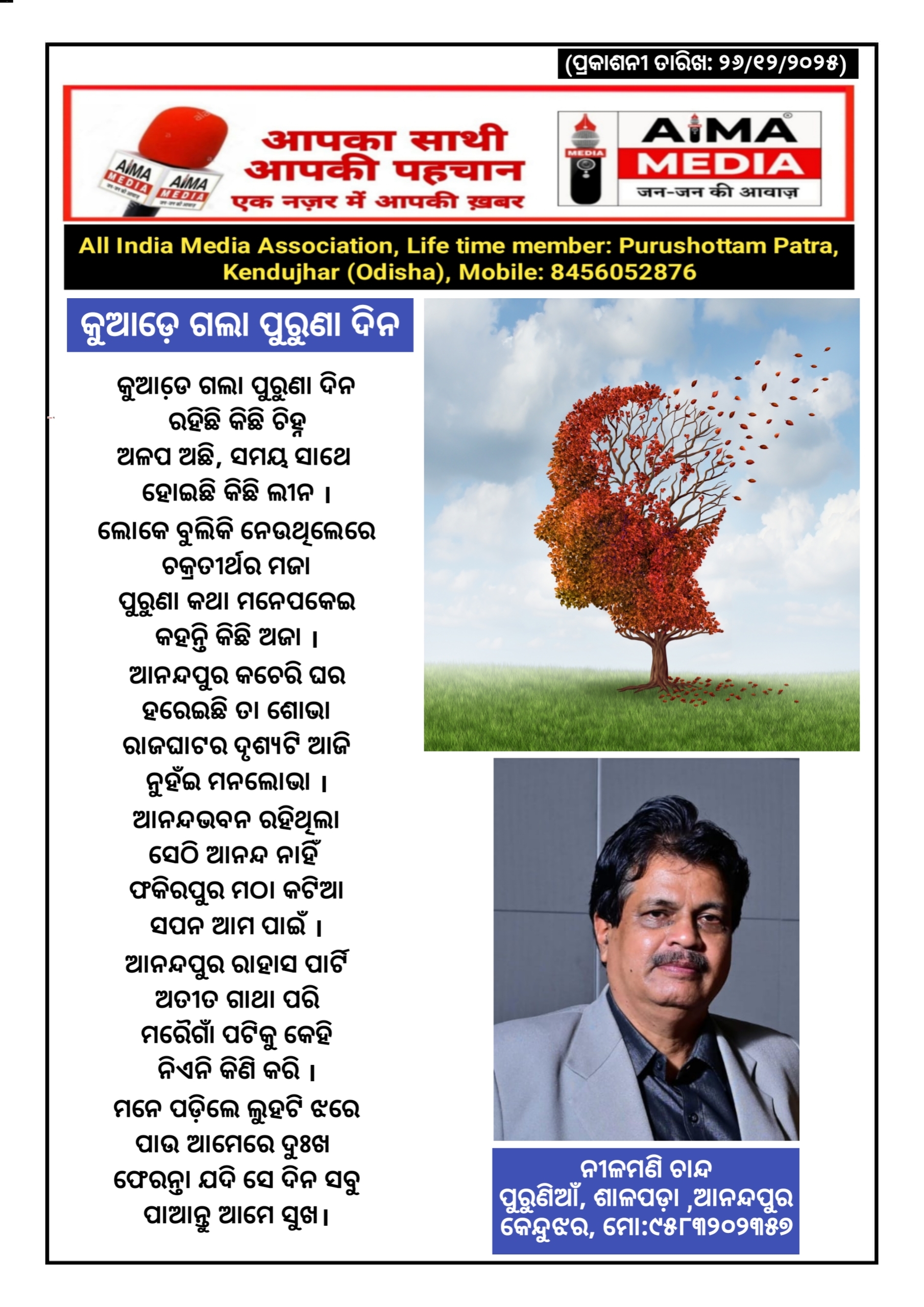 କୁଆଡ଼େ ଗଲା ପୁରୁଣା ଦିନ - ନୀଳମଣି ଚାନ୍ଦ ଙ୍କ ଦ୍ଵାରା ରଚିତ କବିତା।