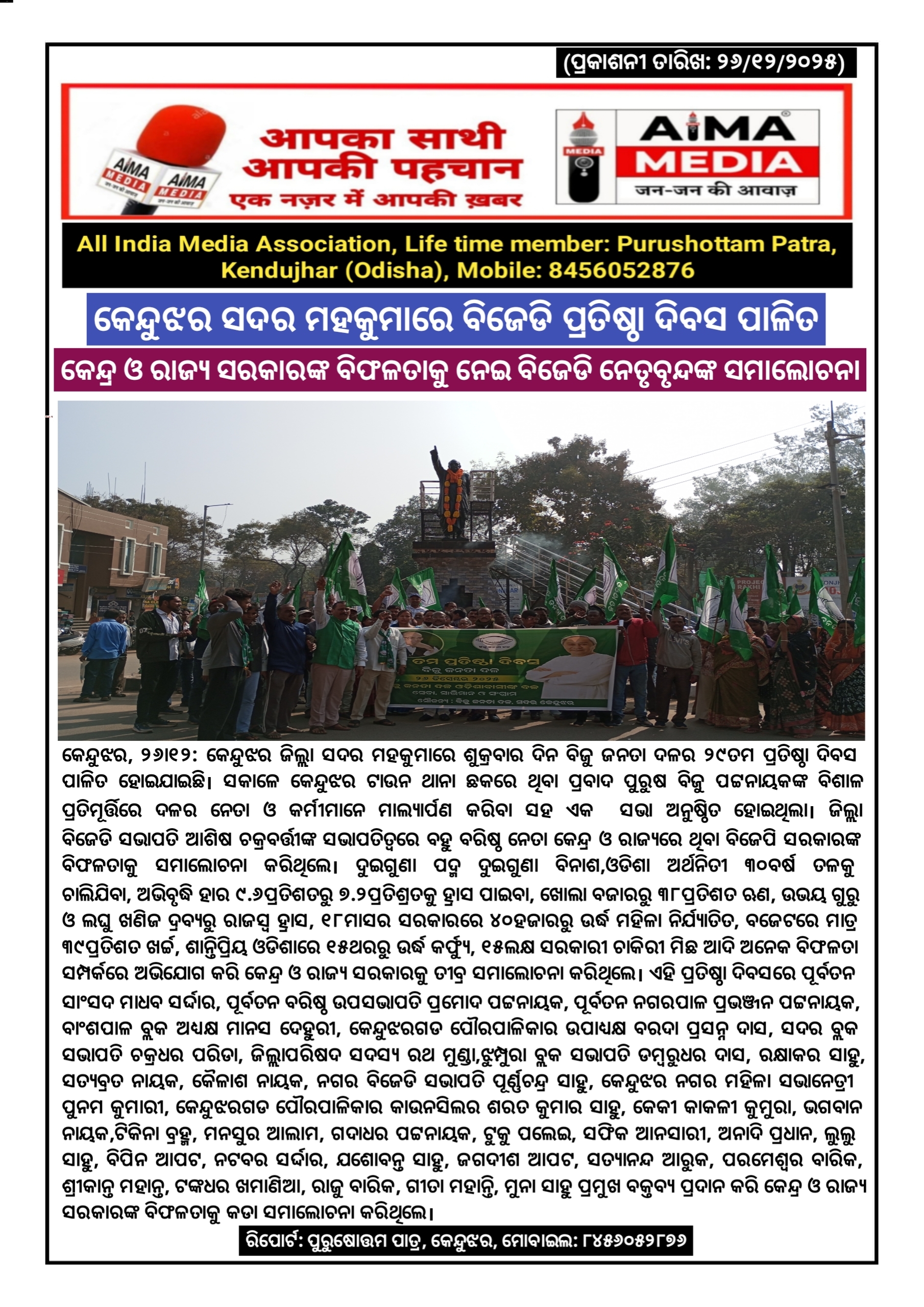 କେନ୍ଦୁଝର, ୨୬ା୧୨: କେନ୍ଦୁଝର ଜିଲ୍ଲା ସଦର ମହକୁମାରେ ଶୁକ୍ରବାର ଦିନ ବିଜୁ ଜନତା ଦଳର ୨୯ତମ ପ୍ରତିଷ୍ଠା ଦିବସ ପାଳିତ ହୋଇଯାଇଛି। ସକାଳେ କେନ୍ଦୁଝର ଟାଉନ ଥାନା ଛକରେ ଥିବା ପ୍ରବାଦ ପୁରୁଷ ବିଜୁ ପଟ୍ଟନାୟକଙ୍କ ବିଶାଳ ପ୍ରତିମୂର୍ତ୍ତିରେ ଦଳର ନେତା ଓ କର୍ମୀମାନେ ମାଲ୍ୟାର୍ପଣ କରିବା ସହ ଏକ ସଭା ଅନୁଷ୍ଠିତ ହୋଇଥିଲା। ଜିଲ୍ଲା ବିଜେଡି ସଭାପତି ଆଶିଷ ଚକ୍ରବର୍ତ୍ତୀଙ୍କ ସଭାପତିତ୍ୱରେ ବହୁ ବରିଷ୍ଠ ନେତା କେନ୍ଦ୍ର ଓ ରାଜ୍ୟରେ ଥିବା ବିଜେପି ସରକାରଙ୍କ ବିଫଳତାକୁ ସମାଲୋଚନା କରିଥିଲେ। ଦୁଇଗୁଣା ପଦ୍ମ ଦୁଇଗୁଣା ବିନାଶ, ଓଡିଶା ଅର୍ଥନିତୀ ୩୦ବର୍ଷ ତଳକୁ ଚାଲିଯିବା, ଅଭିବୃଦ୍ଧି ହାର ୯.୬ପ୍ରତିଶତରୁ ୭.୨ପ୍ରତିଶ୍ରତକୁ ହ୍ରାସ ପାଇବା, ଖୋଲା ବଜାରରୁ ୩୮ପ୍ରତିଶତ ଋଣ, ଉଭୟ ଗୁରୁ ଓ ଲଘୁ ଖଣିଜ ଦ୍ରବ୍ୟରୁ ରାଜସ୍ୱ ହ୍ରାସ, ୧୮ମାସର ସରକାରରେ ୪୦ହଜାରରୁ ଉର୍ଦ୍ଧ ମହିଳା ନିର୍ଯ୍ୟାତିତ,ବଜେଟରେ ମାତ୍ର ୩୯ପ୍ରତିଶତ ଖର୍ଚ୍ଚ, ଶାନ୍ତିପ୍ରିୟ ଓଡିଶାରେ ୧୫ଥରରୁ ଉର୍ଦ୍ଧ କର୍ଫ୍ୟୁ, ୧୫ଲକ୍ଷ ସରକାରୀ ଚାକିରୀ ମିଛ ଆଦି ଅନେକ ବିଫଳତା ସମ୍ପର୍କରେ ଅଭିଯୋଗ କରି କେନ୍ଦ୍ର ଓ ରାଜ୍ୟ ସରକାରକୁ ତୀବ୍ର ସମାଲୋଚନା କରିଥିଲେ। ଏହି ପ୍ରତିଷ୍ଠା ଦିବସରେ ପୂର୍ବତନ ସାଂସଦ ମାଧବ ସର୍ଦ୍ଦାର, ପୂର୍ବତନ ବରିଷ୍ଠ ଉପସଭାପତି ପ୍ରମୋଦ ପଟ୍ଟନାୟକ, ପୂର୍ବତନ ନଗରପାଳ ପ୍ରଭଞ୍ଜନ ପଟ୍ଟନାୟକ, ବାଂଶପାଳ ବ୍ଲକ ଅଧ୍ୟକ୍ଷ ମାନସ ଦେହୁରୀ, କେନ୍ଦୁଝରଗଡ ପୌରପାଳିକାର ଉପାଧ୍ୟକ୍ଷ ବରଦା ପ୍ରସନ୍ନ ଦାସ, ସଦର ବ୍ଲକ ସଭାପତି ଚକ୍ରଧର ପରିଡା, ଜିଲ୍ଲାପରିଷଦ ସଦସ୍ୟ ରଥ ମୁଣ୍ଡା, ଝୁମ୍ପୁରା ବ୍ଲକ ସଭାପତି ଡମ୍ବରୁଧର ଦାସ, ରକ୍ଷାକର ସାହୁ, ସତ୍ୟବ୍ରତ ନାୟକ, କୈଳାଶ ନାୟକ, ନଗର ବିଜେଡି ସଭାପତି ପୂର୍ଣ୍ଣଚନ୍ଦ୍ର ସାହୁ, କେନ୍ଦୁଝର ନଗର ମହିଳା ସଭାନେତ୍ରୀ ପୁନମ କୁମାରୀ, କେନ୍ଦୁଝରଗଡ ପୌରପାଳିକାର କାଉନସିଲର ଶରତ କୁମାର ସାହୁ, କେକୀ କାକଳୀ କୁମୁରା, ଭଗବାନ ନାୟକ, ଟିକିନା ବ୍ରହ୍ମ, ମନସୁର ଆଲାମ, ଗଦାଧର ପଟ୍ଟନାୟକ, ଟୁକୁ ପଲେଇ, ସଫିକ ଆନସାରୀ, ଅନାଦି ପ୍ରଧାନ, ଲୁଲୁ ସାହୁ, ବିପିନ ଆପଟ, ନଟବର ସର୍ଦ୍ଦାର, ଯଶୋବନ୍ତ ସାହୁ, ଜଗଦୀଶ ଆପଟ, ସତ୍ୟାନନ୍ଦ ଆରୁକ, ପରମେଶ୍ୱର ବାରିକ, ଶ୍ରୀକାନ୍ତ ମହାନ୍ତ, ଟଙ୍କଧର ଖମାଣିଆ, ରାଜୁ ବାରିକ, ଗୀତା ମହାନ୍ତି, ମୁନା ସାହୁ ପ୍ରମୁଖ ବକ୍ତବ୍ୟ ପ୍ରଦାନ କରି କେନ୍ଦ୍ର ଓ ରାଜ୍ୟ ସରକାରଙ୍କ ବିଫଳତାକୁ କଡା ସମାଲୋଚନା କରିଥିଲେ ।