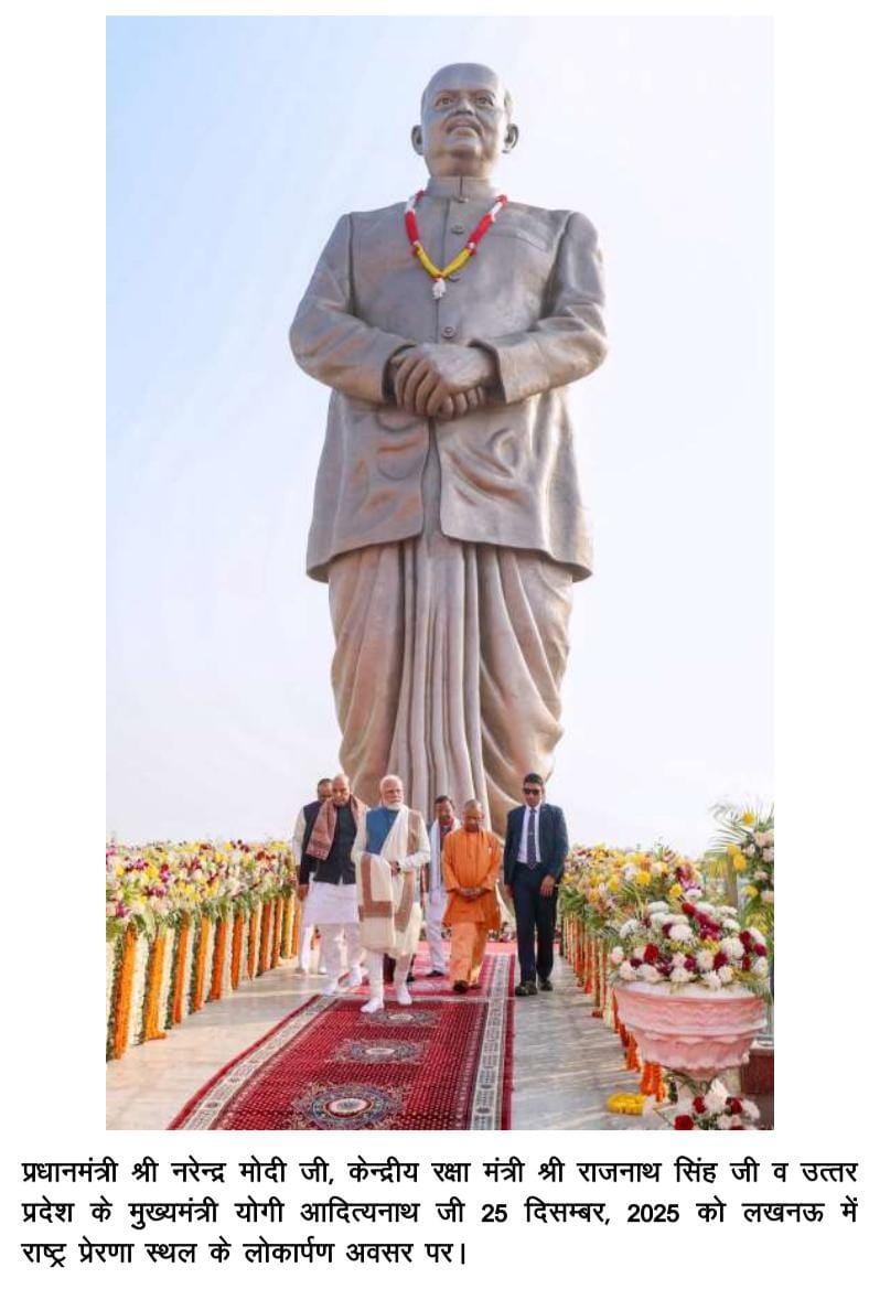 ➡️लखनऊ। प्रधानमंत्री नरेन्द्र मोदी ने गुरुवार को यहां डॉ. श्यामा प्रसाद मुखर्जी, पंडित दीनदयाल उपाध्याय और अटल बिहारी वाजपेयी की विशाल प्रतिमाओँ से युक्त राष्ट्र प्रेरणा स्थल को राष्ट्र को समर्पित किया। उन्होंने कहा कि राष्ट्र प्रेरणा स्थल उस सोच का प्रतीक है जिसने भारत को आत्मसम्मान, एकता और सेवा का मार्ग दिखाया है। यहां स्थापित प्रतिमाएं राष्ट्र निर्माण के लिए सतत प्रेरणा देती हैं। यह स्थल संदेश देता है कि हमारा हर कदम, हर प्रयास और हर संकल्प राष्ट्र निर्माण के लिए समर्पित होना चाहिए। सबका प्रयास ही विकसित भारत के संकल्प को सिद्ध करेगा।