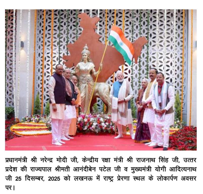 पीएम मोदी के नेतृत्व में भारत बना आत्मनिर्भर, तीनों महापुरुषों की प्रेरणा ने किया मार्गदर्शन मुख्यमंत्री योगी ने प्रधानमंत्री नरेंद्र मोदी का स्वागत करते हुए कहा कि अंत्योदय के स्वप्न को साकार करने वाले, श्रद्धेय अटल जी के सुशासन को मूर्त रूप देने वाले आत्मनिर्भर व आधुनिक भारत के शिल्पकार, ‘एक भारत-श्रेष्ठ भारत’ के स्वप्न दृष्टा प्रधानमंत्री नरेंद्र मोदी के करकमलों से लखनऊ में राष्ट्र प्रेरणा स्थल, तीनों महापुरुषों की भव्य प्रतिमा व म्यूजियम का भव्य लोकार्पण हो रहा है। सीएम योगी ने कहा कि प्रधानमंत्री नरेंद्र मोदी के नेतृत्व में आत्मनिर्भर व विकसित भारत का जो वर्तमान स्वरूप देख रहे हैं, उसमें डॉ. श्यामा प्रसाद मुखर्जी, पं. दीनदयाल उपाध्याय व अटल बिहारी वाजपेयी का मार्गदर्शन प्रेरणा के रूप में है। भारत के उज्ज्वल भविष्य को लेकर अटल जी का उद्घोष था- अंधेरा छंटेगा, सूरज निकलेगा, कमल खिलेगा मुख्यमंत्री योगी ने कहा कि यह अटल बिहारी वाजपेयी का जन्म शताब्दी महोत्सव का वर्ष है। अटल जी कहते थे कि ‘अंधेरा छंटेगा, सूरज निकलेगा, कमल खिलेगा’, यह केवल आशा नहीं, बल्कि भारत के उज्ज्वल भविष्य को लेकर उनके अडिग विश्वास, दूरदृष्टि व दृढ़ संकल्प का उद्घोष था। अटल जी ने कवि, पत्रकार, राष्ट्रवादी विचारक व भारत के सच्चे सपूत के रूप में देश को जो विजन-नेतृत्व दिया। पीएम मोदी के नेतृत्व में हर भारतवासी उसे विकास व विरासत के नए रूप में देख रहा है। आज के महत्वपूर्ण अवसर पर प्रधानमंत्री जी के करकमलों से राष्ट्र प्रेरणा स्थल प्राप्त हो रहा है।