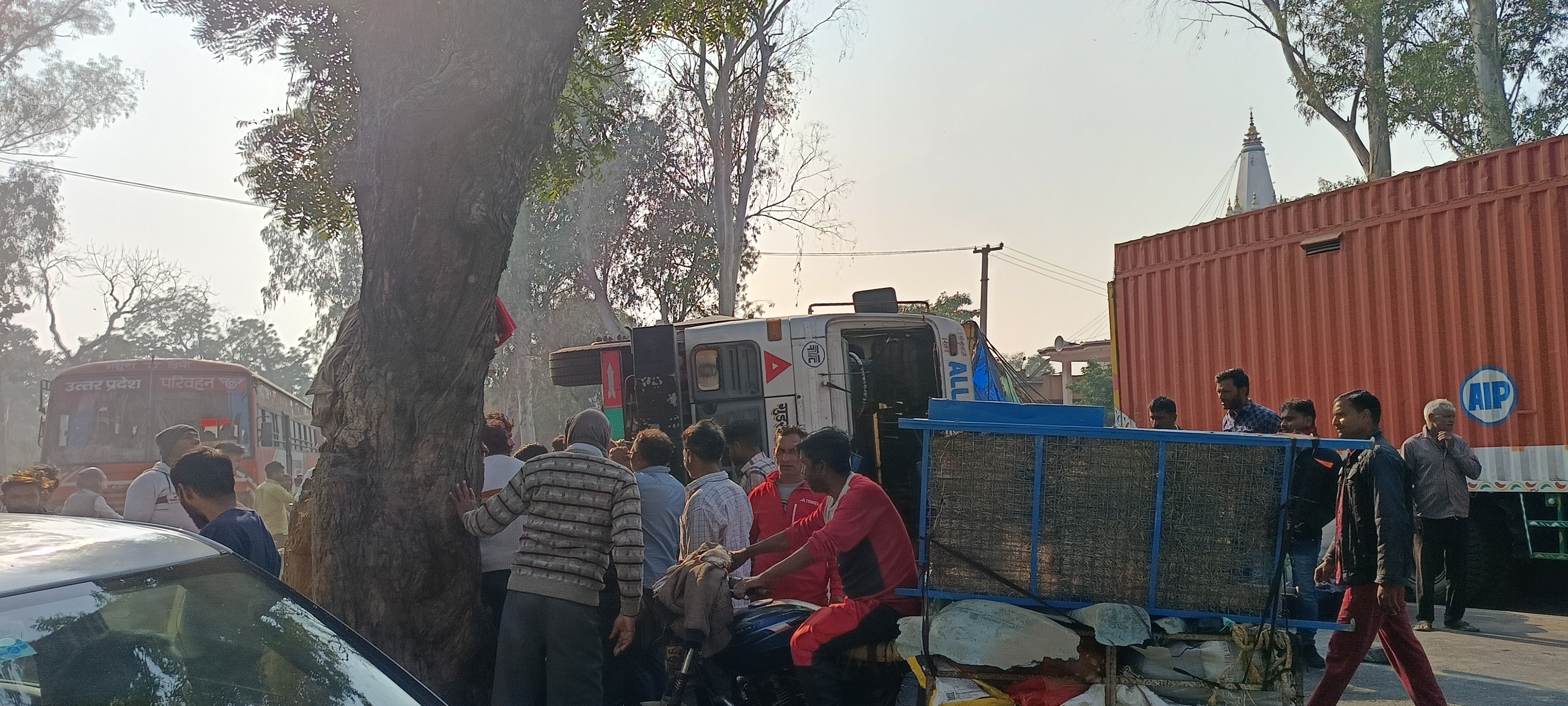 अलीगढ़ मथुरा मार्ग ग्राम तेहरामुझ पर बड़ा हादसा हुआ करीब 3 बजे की यह घटना बताई गई है एक ट्रक ड्राइवर मथुरा से अलीगढ़ जाते समय नियंत्रण खोने से ट्रक पेड़ से टकराया गया यह घटना बीच ऑन रोड पर हुई और ट्रक पलट गया ड्राइवर की गंभीर स्थिति बताई जा रही है और बताया गया कि वह ट्रक में मुर्गी के दाने लोड कर ले जा रहा था अथवा नियंत्रण खोने के कारण यह हादसा होने की आशंका जताई गई है रोड पर सरकारी बस व कार ओर मोटर वाहन को निकलना मुश्किल हो गया प्रशाशन द्वारा तुरंत क्रेन माध्यम से रास्ता को साफ कराया गया जिसके कारण आने जाने में लोगों को आसानी हुई ।