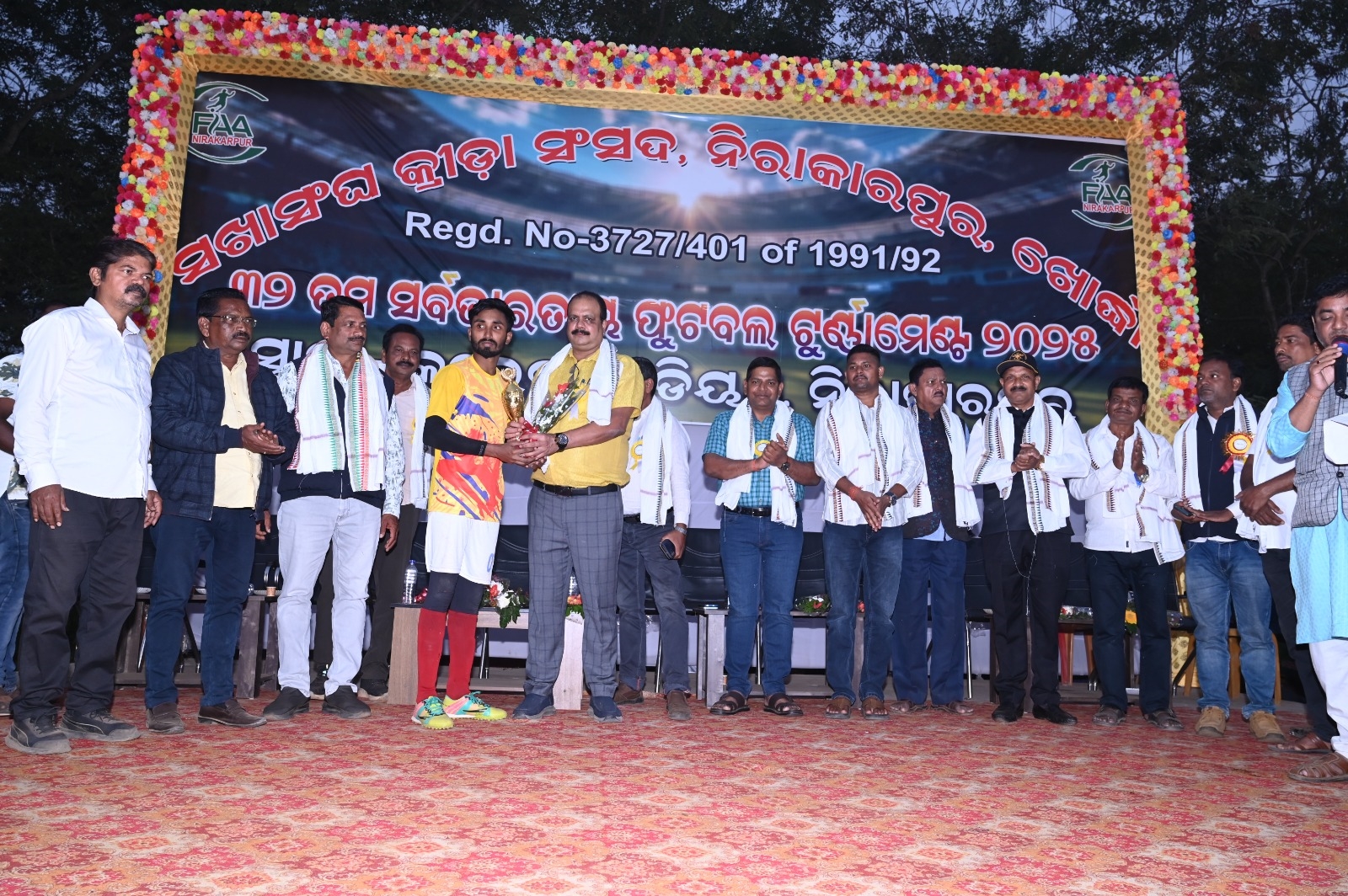 ଖୋର୍ଦ୍ଧା,୨୬/୧୨/୨୫(ଏ.ଆଇ.ଏମ.ଏ):ଖୋର୍ଦ୍ଧା ଜ଼ିଲ୍ଲା ନିରାକାରପୁର ସ୍ଥିତ ସଖାସଙ୍ଘ ଆନୁକୂଲ୍ୟରେ ଚାଲିଥିବା ୩୨ ତମ ସର୍ବଭାରତୀୟ ଫୁଟବଲ ଟୁର୍ଣ୍ଣାମେଣ୍ଟ ରେ ଆଜି ହିନ୍ଦୁସ୍ତାନ ହିରୋଜ କଲିକତା କୁ ୧-୦ ଗୋଲ ରେ ହରାଇ ସି ଭି ରମଣ ଗ୍ଲୋବାଲ ୟୁନିଭରସିଟି ଦ୍ୱିତୀୟ ଦଳ ଭାବେ ସେମି ଫାଇନାଲ କୁ ଉତୀର୍ଣ୍ଣ ହୋଇଛି l ଆଜିର ଖେଳକୁ ବିଜୟ କୁମାର ମଙ୍ଗରାଜ ପରିଚାଳନା କରିଥିବା ବେଳେ, ଲାଇନ ରେ ପ୍ରିୟବ୍ରତ ବାହିନୀପତି, ସାଇରାମ କିସ୍କୋ ସହାୟତା କରିଥିଲେ l , ଅବିନାଶ ପଟ୍ଟନାୟକ ଫୋର୍ଥ ଅଫିସିଆଲ, ଅକ୍ଷୟ କୁମାର ପଟ୍ଟନାୟକ ମ୍ୟାଚ କମିଶନର ,ହୃଦାନନ୍ଦ ମହତ ରାୟ,ଓମ ପ୍ରକାଶ ମିଶ୍ର ସହାୟତା କରିଥିଲେ l ବିପିନ କୁମାର ଜୟସିଂହ ଙ୍କ ପରିଚାଳନାରେ ମୁଖ୍ୟ ଅତିଥି ଭାବେ ଡାକ୍ତର ସିଦ୍ଧାର୍ଥ ଦାଶ,ସମ୍ମାନିତ ଅତିଥିଭାବେ ଖୋର୍ଦ୍ଧା ଆଇନ ମହାବିଦ୍ୟାଳୟ ପ୍ରତିଷ୍ଠାତା ସୁଧୀର ମାନସିଂହ, ନିରାକାରପୁର ଥାନା ଆଇଆଇସି ବିଶ୍ୱଜିତ୍ ରାଉତରାୟ , ଜଙ୍କିଆ ଥାନା ଆଇଆଇସି ସୁଶାନ୍ତ କୁମାର ବେହେରା , ବିଶିଷ୍ଟ ସମାଜସେବୀ ଜାନକୀ ମହାପାତ୍ର, ସରସ୍ଵତୀ ଶିଶୁ ବିଦ୍ୟା ମନ୍ଦିର ସମ୍ପାଦକ ବିଭୂତି ଭୂଷଣ ଆଚାର୍ଯ୍ୟ, କଳିଙ୍ଗ ଭେଟରାନ ଆସୋସିଏସନ୍ ର ସମ୍ପାଦକ ବିପିନ୍ ବିହାରୀ ମାନସିଂହ, ଅଧ୍ୟାପକ ପ୍ରାଣେଶ୍ୱର ଜୟସିଂହ, ଦୋଛିଆଁ ସରପଂଚ ବନମାଳୀ ରାଉତରାୟ ଓ କାଦୁଆଘଟ ସରପଂଚ ଦୁଃଶାସନ ସ୍ୱାଇଁ, ଦେଇପୁର ସରପଞ୍ଚ ଅଜୟ କୁମାର ପ୍ରଧାନ ଉପସ୍ଥିତ ରହି ଖେଳାଳି ମାନଙ୍କୁ ଉତ୍ସାହିତ କରିବା ସହିତ ବେଷ୍ଟ ପ୍ଲେୟାର ଭାବେ ଉଭୟ ଦଳର ଧ୍ୟାନ ଓ ଦେବତମ ଦୁଇ ଖେଳାଳିଙ୍କୁ କେଦାର ଜୟସିଂହ ମେମୋରିଆଲ ଟ୍ରଫି ପ୍ରଦାନ କରିଥିଲେ। ଅବସରପ୍ରାପ୍ତ ଶିକ୍ଷକ କମଳ ଲୋଚନ ପ୍ରଧାନ ଓ ପ୍ରଶାନ୍ତ କୁମାର ପାଟ୍ଟଶାଣୀ ମଞ୍ଚ ପରିଚାଳନା କରିଥିଲେ ।କୁମାରୀ ମେଘନା ବଳିୟାରସିଂହ ଧନ୍ୟବାଦ ପ୍ରଦାନ କରିଥିଲେ ।ଶନିବାର ପ୍ରଥମ ସେମି ଫାଇନାଲ ରେ ସି ଭି ରମଣ ଗ୍ଲୋବାଲ ୟୁନିଭରସିଟି ସହିତ ଧlନବାଦ ଫୁଟବଲ କ୍ଲବ ଝାଡଖଣ୍ଡ ସହିତ ଖେଳ ହେବାର ସଖାସଙ୍ଘ କାର୍ଯ୍ୟକାରୀ ସମ୍ପାଦକ ଦୀପକ ପ୍ରଧାନ ସୂଚନା ଦେଇଛନ୍ତି l