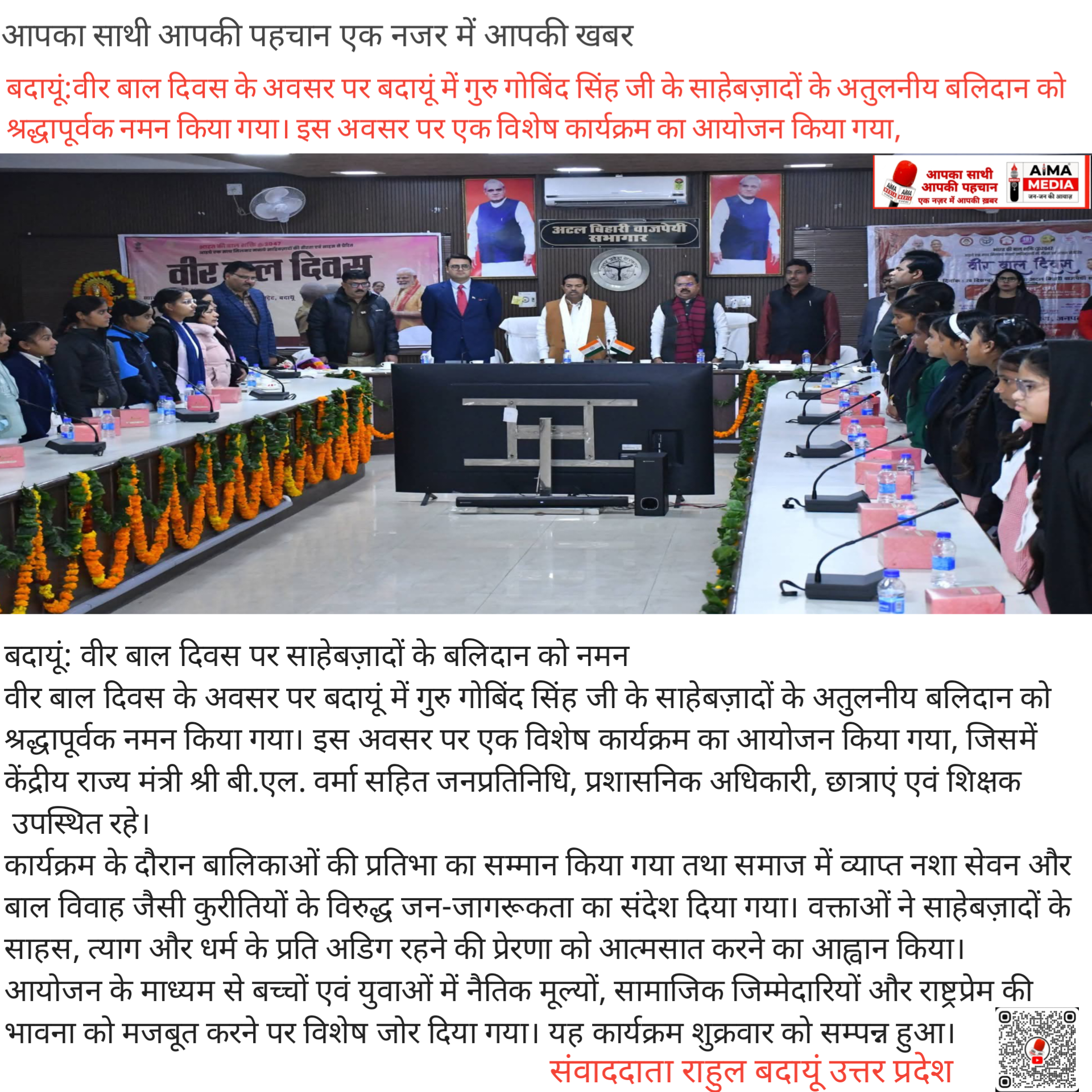 वीर बाल दिवस के अवसर पर बदायूं में गुरु गोबिंद सिंह जी के साहेबज़ादों के अतुलनीय बलिदान को श्रद्धापूर्वक नमन किया गया।