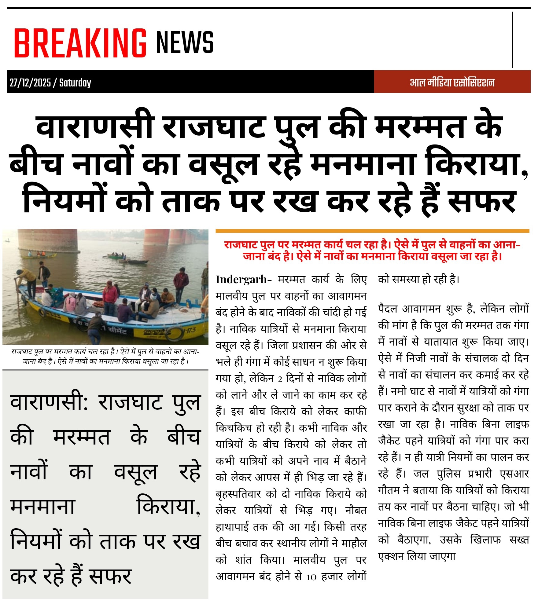 राजघाट पुल पर मरम्मत कार्य चल रहा है। ऐसे में पुल से वाहनों का आना- जाना बंद है। ऐसे में नावों का मनमाना किराया वसूला जा रहा है। Varanasi News: राजघाट पुल की मरम्मत के बीच नावों का वसूल रहे मनमाना किराया, नियमों को ताक पर रख कर रहे हैं सफरनाविक बिना लाइफ जैकेट पहने यात्रियों को गंगा पार करा रहे हैं। न ही यात्री नियमों का पालन कर रहे हैं। जल पुलिस प्रभारी एसआर गौतम ने बताया कि यात्रियों को किराया तय कर नावों पर बैठना चाहिए। जो भी नाविक बिना लाइफ जैकेट पहने यात्रियों को बैठाएगा, उसके खिलाफ सख्त एक्शन लिया जाएगाकभी नाविक और यात्रियों के बीच किराये को लेकर तो कभी यात्रियों को अपने नाव में बैठाने को लेकर आपस में ही भिड़ जा रहे हैं। बृहस्पतिवार को दो नाविक किराये को लेकर यात्रियों से भिड़ गए। नौबत हाथापाई तक की आ गई। किसी तरह बीच बचाव कर स्थानीय लोगों ने माहौल को शांत किया। मालवीय पुल पर आवागमन बंद होने से 10 हजार लोगों को समस्या हो रही है।
