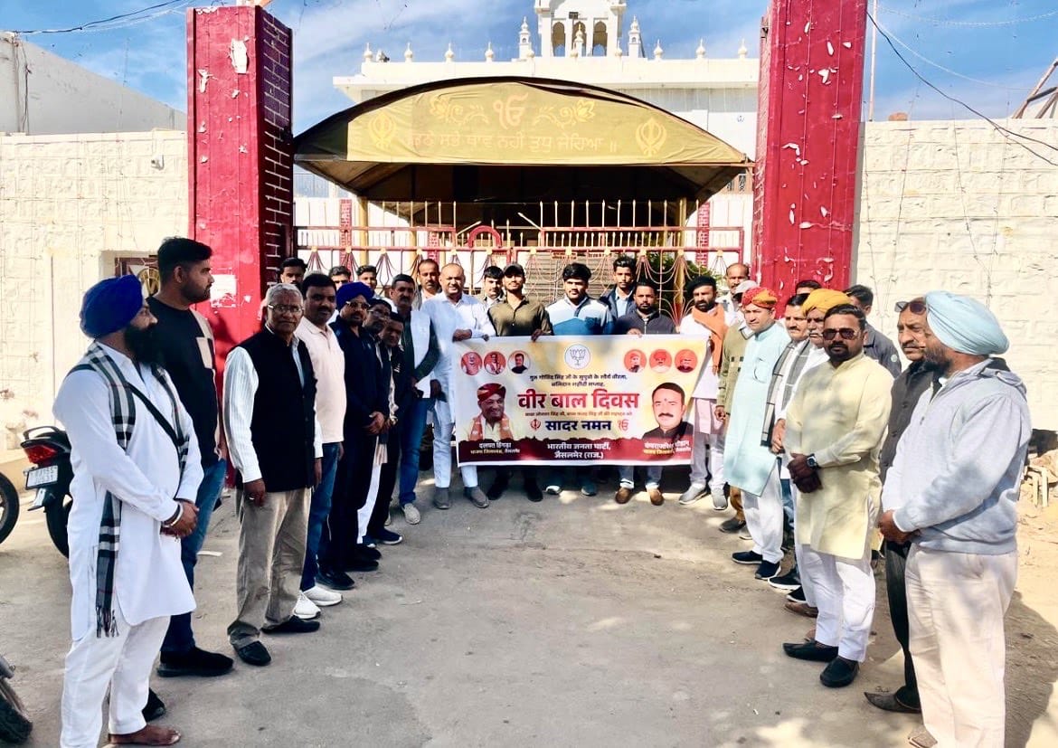 जैसलमेर। सिखों के दसवें गुरु श्री गुरु गोविंद सिंह जी के वीर पुत्रों—साहिबज़ादा जोरावर सिंह जी एवं साहिबज़ादा फतेह सिंह जी—की अमर शहादत को शुक्रवार को गुरुद्वारा में श्रद्धापूर्वक स्मरण किया गया। धर्म संस्कृति और राष्ट्र की रक्षा के लिए अल्पायु में दिए गए उनके सर्वोच्च बलिदान ने सम्पूर्ण भारतवर्ष को सदैव प्रेरणा दी है।प्रधानमंत्री नरेन्द्र मोदी द्वारा 26 दिसंबर को वीर बाल दिवस के रूप में घोषित किया जाना देश के वीर बालकों के अद्वितीय साहस और बलिदान के प्रति सच्ची श्रद्धांजलि है। यह दिवस आने वाली पीढ़ियों को साहस राष्ट्रभक्ति और धर्मनिष्ठा के मूल्यों से जोड़ने का कार्य करेगा।कार्यक्रम जिला सयोजक कंवराज सिंह चौहान ने बताया की इस अवसर पर गुरुद्वारा में गुरु वाणी के अलावा भाजपा जिला कार्यालय में भी श्रद्धांजलि कार्यक्रम आयोजित किया गया जिसमे मुख्य वक्ता विधायक छोटू सिंह भाटी ने कहा कि साहिबज़ादों का बलिदान केवल सिख समाज ही नहीं बल्कि सम्पूर्ण मानवता के लिए प्रेरणास्रोत है। उनके त्याग को स्मरण कर देश की एकता अखंडता और सांस्कृतिक विरासत को सुदृढ़ करने का संकल्प लिया गया।