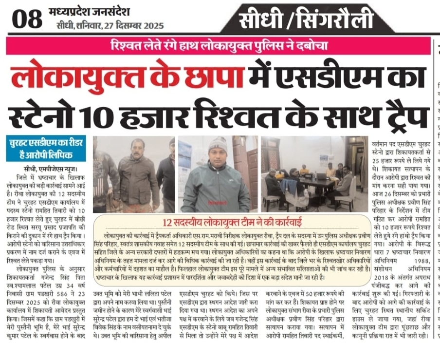 सीधी जिले में भ्रष्टाचार के खिलाफ लोकायुक्त की बड़ी कार्रवाई सामने आई है। रीवा लोकायुक्त की 12 सदस्यीय टीम ने शुक्रवार शाम करीब 5 बजे चुरहट SDM कार्यालय में पदस्थ स्टेनो रामहित तिवारी को 10 हजार रुपये की रिश्वत लेते हुए रंगे हाथ गिरफ्तार कर लिया। यह कार्रवाई लोकायुक्त निरीक्षक एस.आर. मरावी के नेतृत्व में की गई।