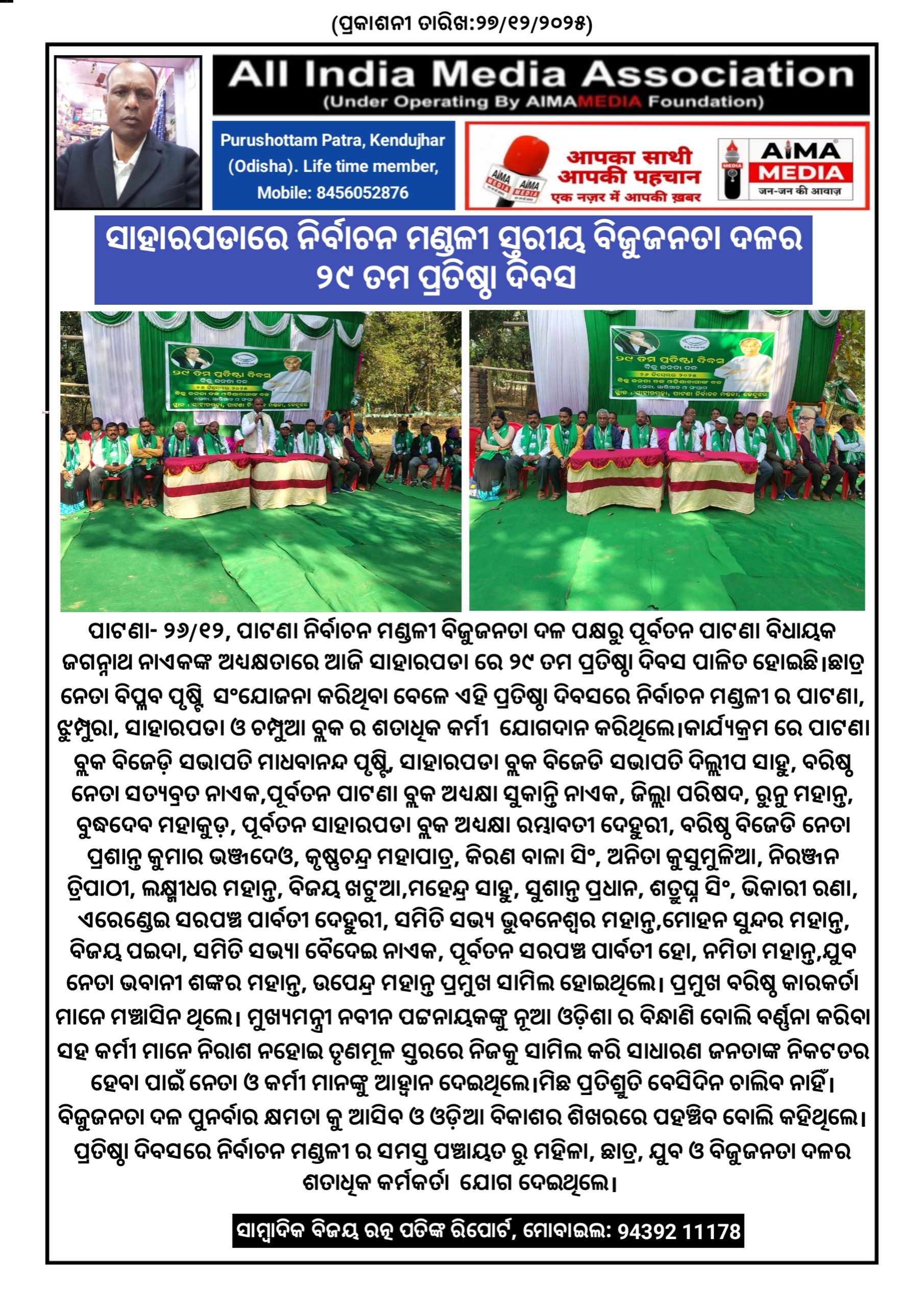 ପାଟଣା-୨୬/୧୨, ପାଟଣା ନିର୍ବାଚନ ମଣ୍ଡଳୀ ବିଜୁଜନତା ଦଳ ପକ୍ଷରୁ ପୂର୍ବତନ ପାଟଣା ବିଧାୟକ ଜଗନ୍ନାଥ ନାଏକଙ୍କ ଅଧ୍ୟକ୍ଷତାରେ ଆଜି ସାହାରପଡା ରେ ୨୯ତମ ପ୍ରତିଷ୍ଠା ଦିବସ ପାଳିତ ହୋଇଛି।ଛାତ୍ର ନେତା ବିପ୍ଳବ ପୃଷ୍ଟି ସଂଯୋଜନା କରିଥିବା ବେଳେ ଏହି ପ୍ରତିଷ୍ଠା ଦିବସରେ ନିର୍ବାଚନ ମଣ୍ଡଳୀ ର ପାଟଣା, ଝୁମ୍ପୁରା, ସାହାରପଡା ଓ ଚମ୍ପୁଆ ବ୍ଲକ ର ଶତାଧିକ କର୍ମୀ ଯୋଗଦାନ କରିଥିଲେ।କାର୍ଯ୍ୟକ୍ରମ ରେ ପାଟଣା ବ୍ଲକ ବିଜେଡ଼ି ସଭାପତି ମାଧବାନନ୍ଦ ପୃଷ୍ଟି,ସାହାରପଡା ବ୍ଲକ ବିଜେଡି ସଭାପତି ଦିଲ୍ଲୀପ ସାହୁ,ବରିଷ୍ଠ ନେତା ସତ୍ୟବ୍ରତ ନାଏକ,ପୂର୍ବତନ ପାଟଣା ବ୍ଲକ ଅଧ୍ୟକ୍ଷା ସୁକାନ୍ତି ନାଏକ, ଜିଲ୍ଲା ପରିଷଦ, ରୁନୁ ମହାନ୍ତ, ବୁଦ୍ଧଦେବ ମହାକୁଡ଼ ,ପୂର୍ବତନ ସାହାରପଡା ବ୍ଲକ ଅଧ୍ୟକ୍ଷା ରମ୍ଭାବତୀ ଦେହୁରୀ,ବରିଷ୍ଠ ବିଜେଡି ନେତା ପ୍ରଶାନ୍ତ କୁମାର ଭଞ୍ଜଦେଓ,କୃଷ୍ଣଚନ୍ଦ୍ର ମହାପାତ୍ର,କିରଣ ବାଳା ସିଂ,ଅନିତା କୁସୁମୁଳିଆ,ନିରଞ୍ଜନ ତ୍ରିପାଠୀ, ଲକ୍ଷ୍ମୀଧର ମହାନ୍ତ, ବିଜୟ ଖଟୁଆ,ମହେନ୍ଦ୍ର ସାହୁ, ସୁଶାନ୍ତ ପ୍ରଧାନ, ଶତ୍ରୁଘ୍ନ ସିଂ, ଭିକାରୀ ରଣା, ଏରେଣ୍ଡେଇ ସରପଞ୍ଚ ପାର୍ବତୀ ଦେହୁରୀ, ସମିତି ସଭ୍ୟ ଭୁବନେଶ୍ଵର ମହାନ୍ତ,ମୋହନ ସୁନ୍ଦର ମହାନ୍ତ, ବିଜୟ ପଇଦା, ସମିତି ସଭ୍ୟା ବୈଦେଇ ନାଏକ, ପୂର୍ବତନ ସରପଞ୍ଚ ପାର୍ବତୀ ହୋ , ନମିତା ମହାନ୍ତ,ଯୁବ ନେତା ଭବାନୀ ଶଙ୍କର ମହାନ୍ତ, ଉପେନ୍ଦ୍ର ମହାନ୍ତ ପ୍ରମୁଖ ସାମିଲ ହୋଇଥିଲେ। ପ୍ରମୁଖ ବରିଷ୍ଠ କାରକର୍ତା ମାନେ ମଞ୍ଚାସିନ ଥିଲେ। ମୁଖ୍ୟମନ୍ତ୍ରୀ ନବୀନ ପଟ୍ଟନାୟକଙ୍କୁ ନୂଆ ଓଡ଼ିଶା ର ବିନ୍ଧାଣି ବୋଲି ବର୍ଣ୍ଣନା କରିବା ସହ କର୍ମୀ ମାନେ ନିରାଶ ନହୋଇ ତୃଣମୂଳ ସ୍ତରରେ ନିଜକୁ ସାମିଲ କରି ସାଧାରଣ ଜନତାଙ୍କ ନିକଟତର ହେବା ପାଇଁ ନେତା ଓ କର୍ମୀ ମାନଙ୍କୁ ଆହ୍ୱାନ ଦେଇଥିଲେ।ମିଛ ପ୍ରତିଶ୍ରୁତି ବେସିଦିନ ଚାଲିବ ନାହିଁ।ବିଜୁଜନତା ଦଳ ପୁନର୍ବାର କ୍ଷମତା କୁ ଆସିବ ଓ ଓଡ଼ିଆ ବିକାଶର ଶିଖରରେ ପହଞ୍ଚିବ ବୋଲି କହିଥିଲେ।ପ୍ରତିଷ୍ଠା ଦିବସରେ ନିର୍ବାଚନ ମଣ୍ଡଳୀ ର ସମସ୍ତ ପଞ୍ଚାୟତ ରୁ ମହିଳା,ଛାତ୍ର, ଯୁବ ଓ ବିଜୁଜନତା ଦଳର ଶତାଧିକ କର୍ମକର୍ତା ଯୋଗ ଦେଇଥିଲେ ।