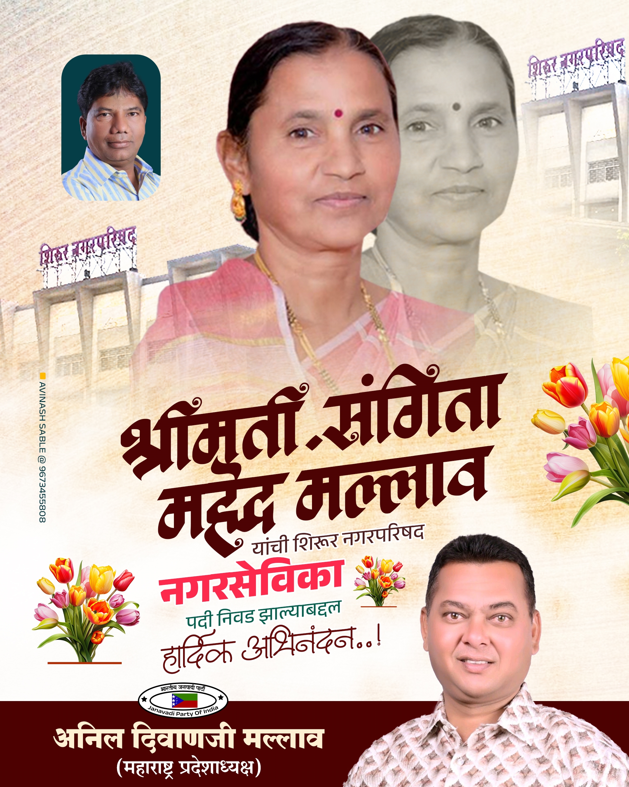 शिरूर नगर परिषद सार्वत्रिक निवडणुकीत प्रभाग क्रमांक 1 मधून श्रीमती संगीता महेंद्र मल्लाव प्रचंड मताधिक्यांनी विजयी झाल्या.