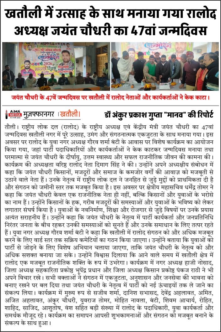 तौली। राष्ट्रीय लोक दल (रालोद) के राष्ट्रीय अध्यक्ष एवं केंद्रीय मंत्री जयंत चौधरी का 47वां जन्मदिवस खतौली नगर में पूरे उत्साह, उमंग और संगठनात्मक एकजुटता के साथ मनाया गया। इस अवसर पर रालोद के युवा नगर अध्यक्ष गौरव शर्मा बंटी के आवास पर विशेष कार्यक्रम का आयोजन किया गया, जहां पार्टी पदाधिकारियों और कार्यकर्ताओं ने केक काटकर जन्मदिवस मनाया तथा परमात्मा से जयंत चौधरी के दीर्घायु, उत्तम स्वास्थ्य और सफल राजनीतिक जीवन की कामना की। कार्यक्रम की अध्यक्षता वरिष्ठ रालोद नेता दिमाग सिंह ने की। उन्होंने अपने अध्यक्षीय संबोधन में कहा कि जयंत चौधरी किसानों, मजदूरों और समाज के कमजोर वर्गों की आवाज़ को मजबूती से उठाने वाले नेता हैं। उनके नेतृत्व में राष्ट्रीय लोक दल ने जनहित से जुड़े मुद्दों को प्राथमिकता दी है और संगठन को जमीनी स्तर तक मजबूत किया है। इस अवसर पर क्षेत्रीय महासचिव धर्मेंद्र तोमर ने कहा कि जयंत चौधरी केवल एक राजनीतिक नेता ही नहीं, बल्कि किसानों और युवाओं के भरोसे का नाम हैं। उन्होंने किसानों के हक, गरीब मजदूरों की समस्याओं और युवाओं के भविष्य को लेकर लगातार संघर्ष किया है। युवाओं के नवनिर्माण, शिक्षा और रोजगार से जुड़े विषयों पर उनके प्रयास अत्यंत सराहनीय हैं। उन्होंने कहा कि जयंत चौधरी के नेतृत्व में पार्टी कार्यकर्ता और जनप्रतिनिधि निरंतर जनता के बीच रहकर उनकी समस्याओं को सुनते हैं और उनके समाधान के लिए तत्पर रहते हैं। युवा नगर अध्यक्ष गौरव शर्मा बंटी ने कहा कि खतौली में रालोद संगठन को और अधिक मजबूत करने के लिए वार्ड स्तर तक सक्रिय कमेटियों का गठन किया जाएगा। उन्होंने बताया कि युवाओं को पार्टी से जोड़ने के लिए विशेष अभियान चलाया जाएगा, ताकि जयंत चौधरी के नेतृत्व को और अधिक सशक्त बनाया जा सके। उन्होंने विश्वास दिलाया कि आने वाले समय में खतौली क्षेत्र में रालोद एक मजबूत राजनीतिक शक्ति के रूप में उभरेगा। कार्यक्रम में नगर अध्यक्ष हाजी नोसाद, जिला अध्यक्ष सहकारिता प्रकोष्ठ भूपेंद्र प्रधान और जिला अध्यक्ष किसान प्रकोष्ठ पंकज राठी ने भी अपने विचार रखे। सभी वक्ताओं ने संगठन में एकजुटता, अनुशासन और जनसेवा की भावना को बनाए रखने पर बल दिया तथा जयंत चौधरी के नेतृत्व में पार्टी को नई ऊंचाइयों तक ले जाने का संकल्प लिया। कार्यक्रम में मुख्य रूप से सजीव शर्मा, दानिश सभासद, देवेंद्र अहलावत, अमित, अजित अहलावत, अंकुर चौधरी, युवराज तोमर, मोहित नावला, बंटी, शिवम आचार्य, रोहित, शाहिद, साजिद, आशुतोष, वंश सहित बड़ी संख्या में रालोद के पदाधिकारी, युवा कार्यकर्ता और समर्थक मौजूद रहे। कार्यक्रम का समापन आपसी शुभकामनाओं और संगठन को मजबूत बनाने के संकल्प के साथ हुआ।