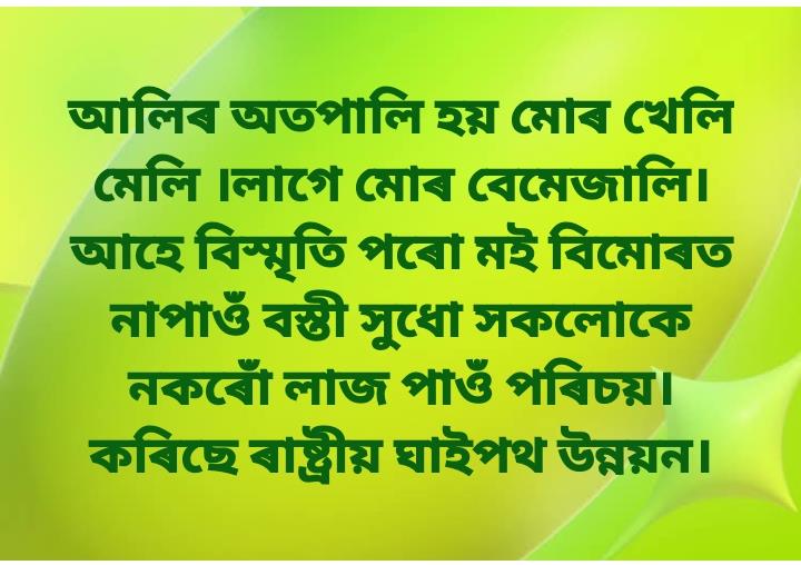 ৰাষ্ট্ৰীয় ঘাই পথৰ উন্নয়নৰ ফলত আমাৰ সকলোৰে বহু সমস্যাৰ সৃষ্টি হৈছে ।সেই সমস্যাবোৰ বিস্তৃত ভাৱে উল্লেখ কৰাতকৈ উক্তি উল্লেখ কৰিব চেষ্টা কৰিছোঁ।
