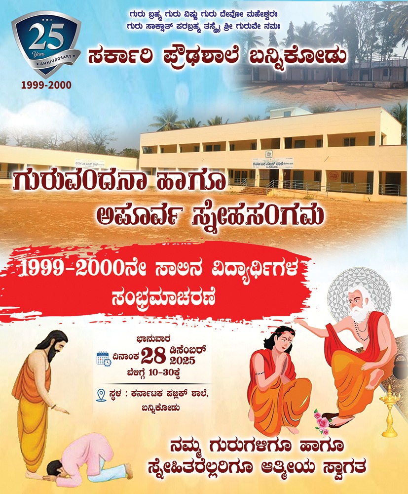 ಕಾರ್ಯಕ್ರಮವು ಭಾನುವಾರ, ಡಿಸೆಂಬರ್ 28, 2025ರಂದು ಬೆಳಿಗ್ಗೆ 10.30ಕ್ಕೆ ಬನ್ನಿಕೋಡು ಕರ್ನಾಟಕ ಪಬ್ಲಿಕ್ ಶಾಲೆಯಲ್ಲಿ ನಡೆಯಲಿದೆ. ಈ ಸಂದರ್ಭದಲ್ಲಿ ಶಾಲೆಯಲ್ಲಿ ಸೇವೆ ಸಲ್ಲಿಸಿದ ಎಲ್ಲಾ ಗೌರವಾನ್ವಿತ ಪೂರ್ವಗುರುಗಳನ್ನು ಆತ್ಮೀಯವಾಗಿ ಸನ್ಮಾನಿಸಿ, ಅವರೊಂದಿಗೆ ಹಳೆಯ ನೆನಪುಗಳನ್ನು ಹಂಚಿಕೊಳ್ಳುವ ಭಾವಪೂರ್ಣ ಕ್ಷಣಗಳಿಗೆ ವೇದಿಕೆ ಕಲ್ಪಿಸಲಾಗುತ್ತದೆ.