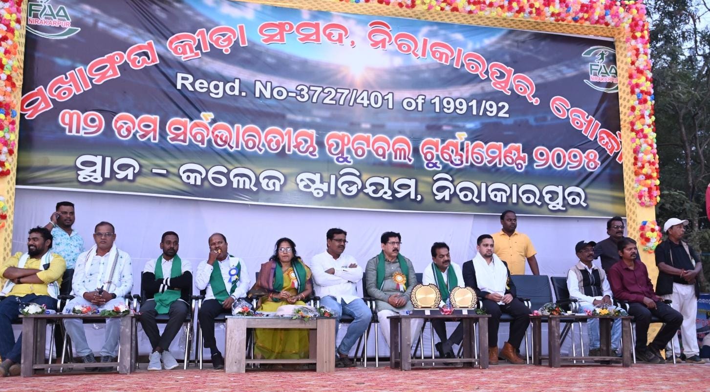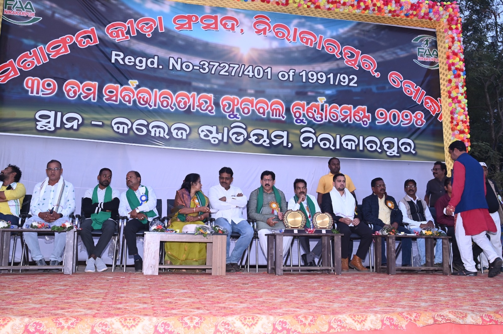 ଖୋର୍ଦ୍ଧା,୨୬/୧୨/୨୫(ଏ.ଆଇ.ଏମ.ଏ):ଖୋର୍ଦ୍ଧା ଜ଼ିଲ୍ଲା ନିରାକାରପୁର ସ୍ଥିତ ସଖାସଙ୍ଘ ଆନୁକୂଲ୍ୟରେ ଚାଲିଥିବା ୩୨ ତମ ସର୍ବଭାରତୀୟ ଫୁଟବଲ ଟୁର୍ଣ୍ଣାମେଣ୍ଟ ରେ ଆଜି ସି ଭି ରମଣ ଗ୍ଲୋବାଲ ୟୁନିଭରସିଟି କୁ ୪-୧ ଟ୍ରାଇବ୍ରେକର ଗୋଲ ରେ ହରାଇ ଧlନବାଦ ପ୍ରଥମ ଦଳ ଭାବେ ଫାଇନାଲ କୁ ଉତୀର୍ଣ୍ଣ ହୋଇଛି l ଆଜିର ଖେଳକୁ ଶେଖlବତ, ପରିଚାଳନା କରିଥିବା ବେଳେ, ଲାଇନ ରେ ପ୍ରିୟବ୍ରତ ବାହିନୀପତି, ସାଇରାମ କିସ୍କୋ ସହାୟତା କରିଥିଲେ l , ଅବିନାଶ ପଟ୍ଟନାୟକ ଫୋର୍ଥ ଅଫିସିଆଲ, ଅକ୍ଷୟ କୁମାର ପଟ୍ଟନାୟକ ମ୍ୟାଚ କମିଶନର ,ହୃଦାନନ୍ଦ ମହତ ରାୟ,ଓମ ପ୍ରକାଶ ମିଶ୍ର ସହାୟତା କରିଥିଲେ l ବିପିନ କୁମାର ଜୟସିଂହ ଙ୍କ ପରିଚାଳନାରେ ମୁଖ୍ୟ ଅତିଥି ଭାବେ ଖୋର୍ଦ୍ଧା ଓ ବେଗୁନିଆ ର ପୂର୍ବତନ ବିଧାୟକ ରାଜେନ୍ଦ୍ର କୁମାର ସାହୁ, ବିଶିଷ୍ଟ ଅତିଥି ଭାବେ ସତ୍ୟବାଦୀ ବିଧାୟକ ଉମାକାନ୍ତ ସାମନ୍ତରାୟ, ସମ୍ମାନିତ ଅତିଥି ଭାବେ ଯୁବ ଡାକ୍ତର ରାୟ, ଟାଙ୍ଗୀ ବ୍ଲକ ଅଧକ୍ଷା ରିସ୍ନା ମାନ୍ଧାତା,ସରପଞ୍ଚ ସୌରଭ ମହାପାତ୍ର,ଯୁବ ନେତା ସୁନୀଲ ନରେନ୍ଦ୍ର, ସମିତିସଭ୍ୟ ରମେଶ ବିଶ୍ୱାଳ ଉପସ୍ଥିତ ରହି ଖେଳାଳି ମାନଙ୍କୁ ଉତ୍ସାହିତ କରିବା ସହିତ ବେଷ୍ଟ ପ୍ଲେୟାର ଭାବେଧାନବାଦ ଦଳର ୩ ନଂ ଓ ସି ଭି ରମଣ ର ୮ ନଂ ଖେଳାଳି ଦ୍ବୟ ଙ୍କୁ କେଦାର ଜୟସିଂହ ମେମୋରିଆଲ ଟ୍ରଫି ପ୍ରଦାନ କରିଥିଲେ। ଅବସରପ୍ରାପ୍ତ ଶିକ୍ଷକ କମଳ ଲୋଚନ ପ୍ରଧାନ ଓ ପ୍ରଶାନ୍ତ କୁମାର ପାଟ୍ଟଶାଣୀ ମଞ୍ଚ ପରିଚାଳନା କରିଥିଲେ ।କୁମାରୀ ମେଘନା ବଳିୟାରସିଂହ ଧନ୍ୟବାଦ ପ୍ରଦାନ କରିଥିଲେ ।ରବିବାର ଦ୍ୱିତୀୟ ସେମି ଫାଇନାଲ ରେ ଏସ ପି ଏମ ବିଶାଖାପାଟଣା ସହିତ ଶବର ସ୍ପୋର୍ଟିଂ ଭୁବନେଶ୍ୱର ସହିତ ଖେଳ ହେବାର ସଖାସଙ୍ଘ କାର୍ଯ୍ୟକାରୀ ସମ୍ପାଦକ ଦୀପକ ପ୍ରଧାନ ସୂଚନା ଦେଇଛନ୍ତି l