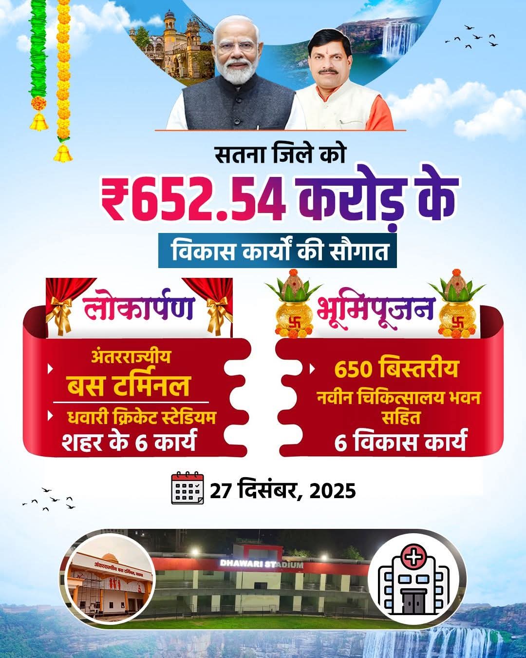 हमारे सतना जिले को आज अंतरराज्यीय बस टर्मिनल, धवारी क्रिकेट स्टेडियम और 6 विकास कार्यों के लोकार्पण की मिलेगी सौगात। साथ ही 650 बिस्तरीय नवीन चिकित्सालय भवन और 6 विकास कार्यों का भूमिपूजन होगा।
