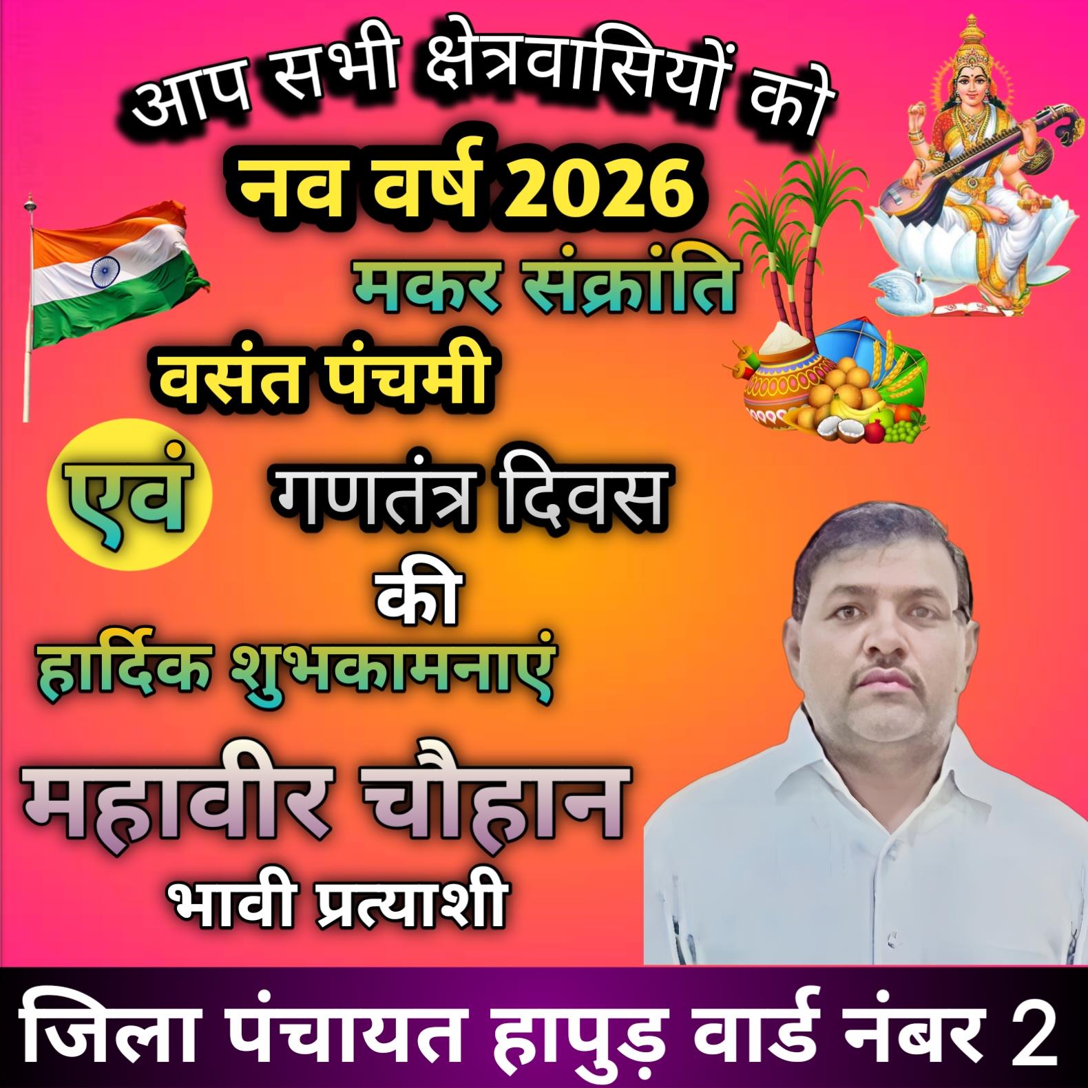 गढ़मुक्तेश्वर। वार्ड नंबर 2 से समाजसेवी भावी प्रत्याशी महावीर चौहान ने क्षेत्र के सभी नागरिकों को नववर्ष, बसंत पंचमी तथा गणतंत्र दिवस 26 जनवरी की हार्दिक शुभकामनाएं प्रेषित की हैं।