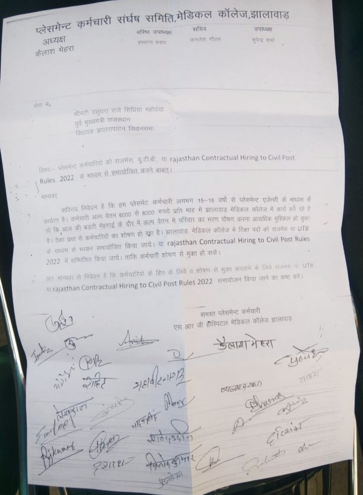 कर्मचारियों ने मांग की है कि या तो उन्हें मेडिकल कॉलेज झालावाड़ में राजमेस /यूटीबी (UTB) के माध्यम से समायोजित किया जाए अथवा राजस्थान कॉन्ट्रैक्चुअल हायरिंग टू सिविल पोस्ट रूल्स 2022 के अंतर्गत शामिल कर नियमित किया जाए, ताकि उन्हें सेवा सुरक्षा मिल सके और भविष्य असुरक्षित न रहे।