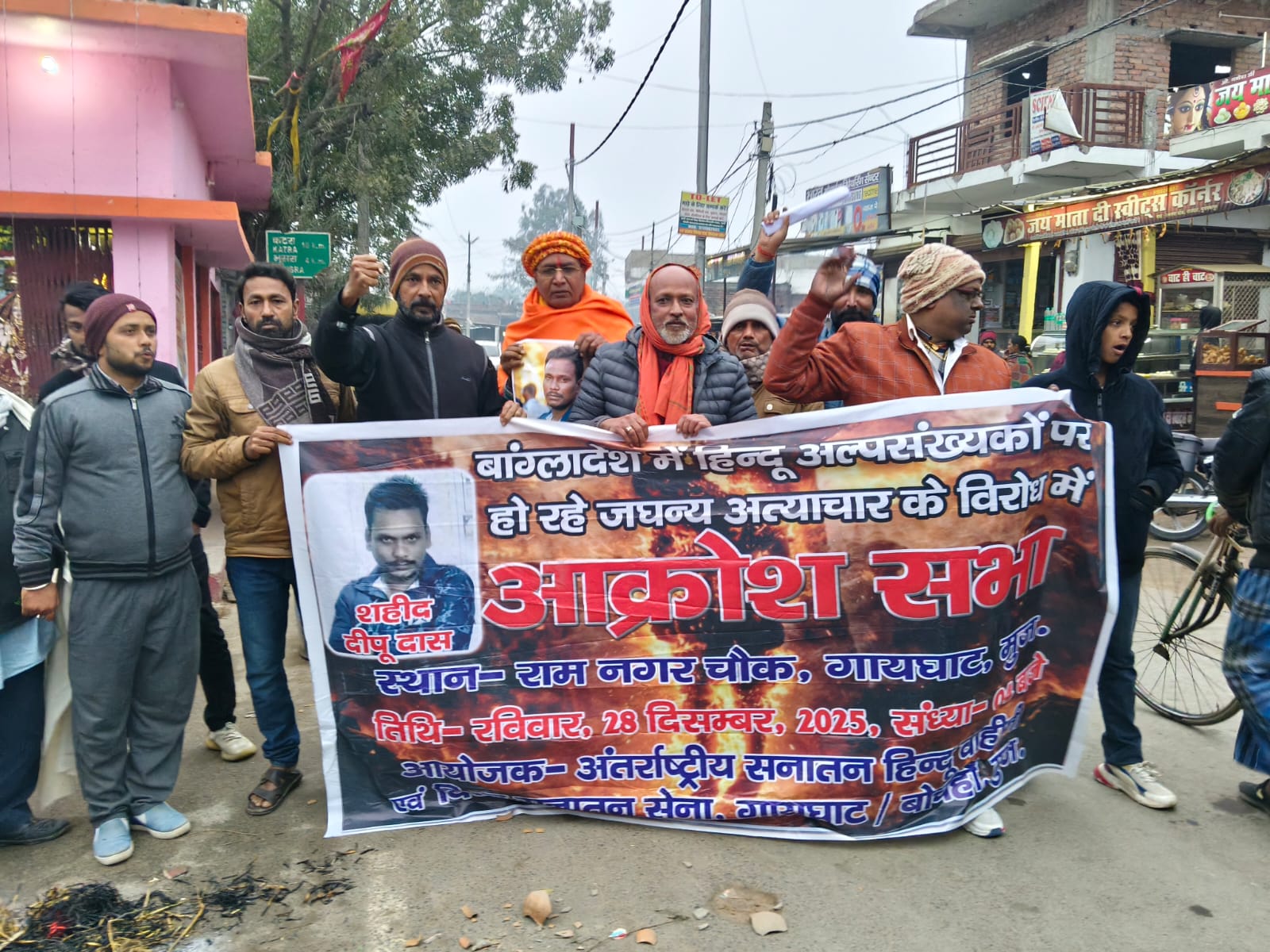 बांग्लादेश में हिन्दुओं पर हो रहे अत्याचार व नरसंहार के विरोध में मुजफ्फरपुर जिला के गायघाट प्रखंड अंतर्गत रामनगर चौक पर अंतरराष्ट्रीय सनातन वाहिनी के कार्यकर्ताओं ने विरोध प्रदर्शन किया। इस दौरान प्रदर्शनकारियों ने बांग्लादेश के प्रधानमंत्री मो. युनुस का पुतला दहन कर आक्रोश जताया। कार्यक्रम का नेतृत्व भाजपा नेता प्रणय कुमार सिंह उर्फ प्राणु ने किया। प्रदर्शन के दौरान बड़ी संख्या में जुटे लोगों ने मुस्लिम आतंकवाद के खिलाफ नारेबाजी करते हुए कड़ा विरोध दर्ज कराया। सभा को संबोधित करते हुए अंतरराष्ट्रीय सनातन वाहिनी के केंद्रीय प्रमुख आचार्य चंद्र किशोर पराशर ने कहा कि बांग्लादेश में मौजूदा हालात अत्यंत चिंताजनक हैं। उन्होंने आरोप लगाया कि वहां अल्पसंख्यकों पर लगातार अत्याचार हो रहे हैं, जिस पर विश्व समुदाय को गंभीरता दिखानी चाहिए। आचार्य पराशर ने संयुक्त राष्ट्र संघ से मांग की कि बांग्लादेश में अविलंब शांति सेना भेजी जाए, ताकि वहां स्थिरता और सुरक्षा बहाल हो सके। साथ ही उन्होंने भारत सरकार से बांग्लादेश के साथ राजनीतिक, व्यापारिक समेत सभी प्रकार के संबंध तत्काल समाप्त करने की मांग की। उन्होंने कहा कि इस्लामिक आतंकवाद अब केवल किसी एक देश की समस्या नहीं रह गया है, बल्कि यह पूरे विश्व के लिए गंभीर खतरा बन चुका है। प्रदर्शन को संबोधित करते हुए भाजपा के स्थानीय नेताओं ने भी अपने विचार रखे और कहा कि देश की सुरक्षा और संप्रभुता के साथ किसी भी प्रकार का समझौता नहीं किया जाएगा।