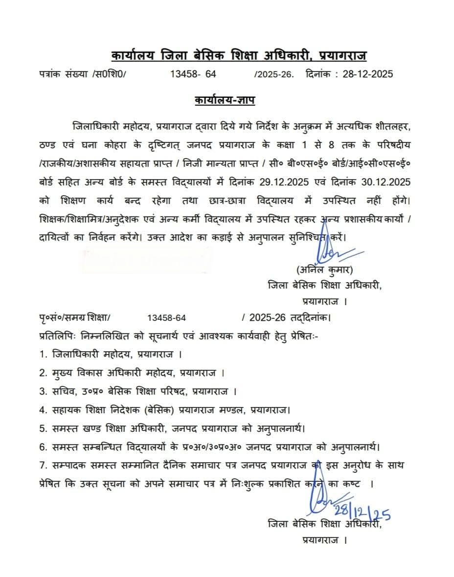 जनपद में बढ़ती शीतलहर, अत्यधिक ठंड एवं घने कोहरे को देखते हुए जिलाधिकारी प्रयागराज के निर्देश पर कक्षा 1 से 8 तक के सभी विद्यालयों में 29 व 30 दिसम्बर 2025 को शिक्षण कार्य स्थगित कर दिया गया है।