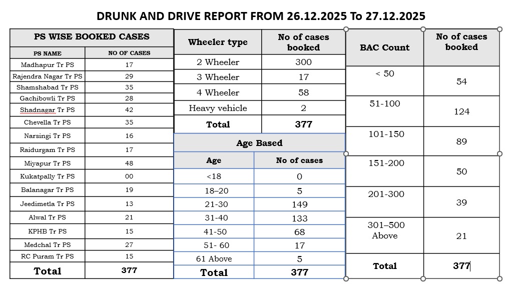 Cyberabad Traffic Police (CTP) conducted a special drunk driving enforcement drive over the weekend, resulting in the *apprehension of 377 offenders.*
