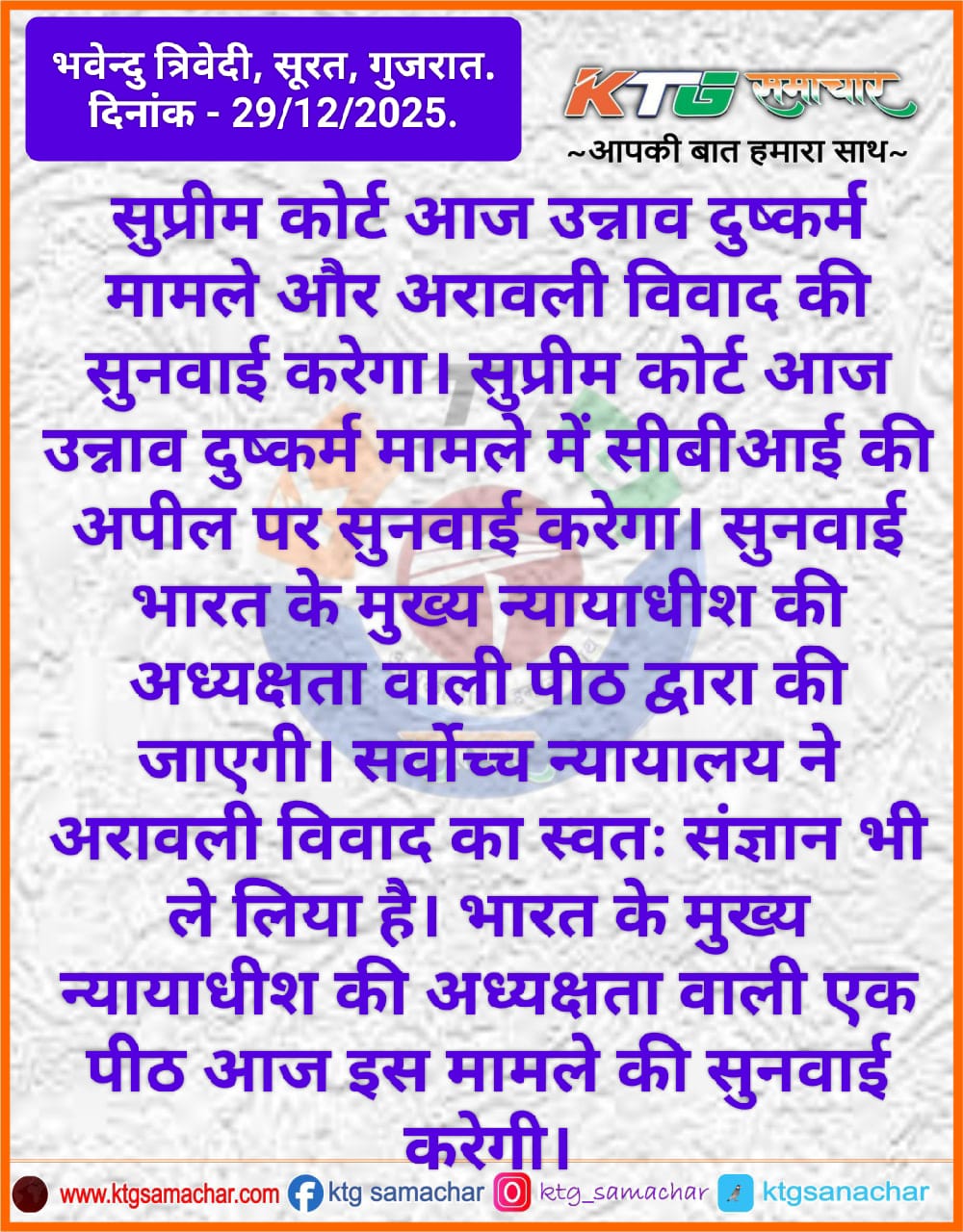 सुप्रीम कोर्ट आज उन्नाव दुष्कर्म मामले और अरावली विवाद की सुनवाई करेगा।