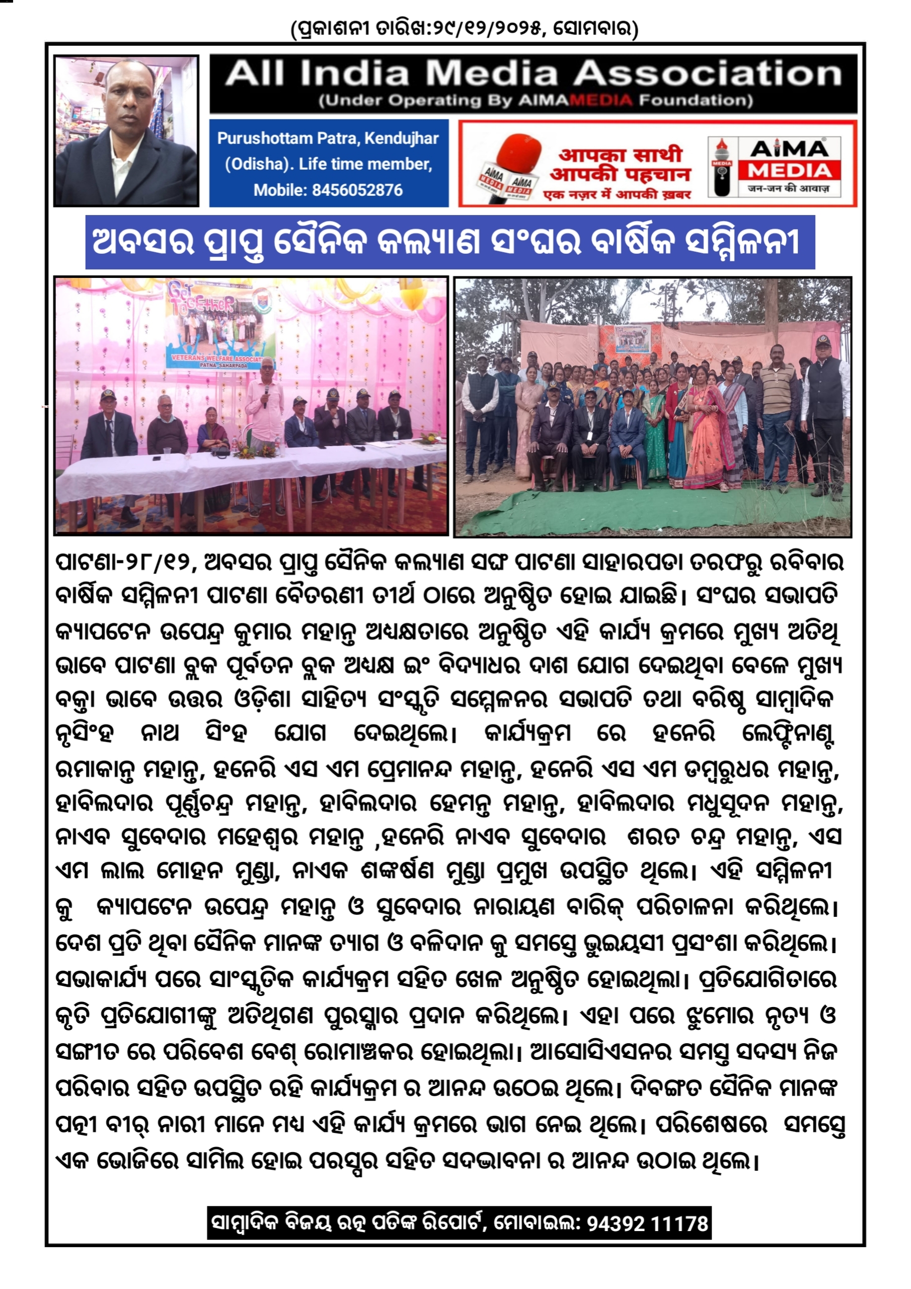 ପାଟଣା-ଅଵସର ପ୍ରାପ୍ତ ସୈନିକ କଲ୍ୟାଣ ସଙ୍ଘ ପାଟଣା ସାହାରପଡା ତରଫରୁ ରବିବାର ବାର୍ଷିକ ସମ୍ମିଳନୀ ପାଟଣା ବୈତରଣୀ ତୀର୍ଥ ଠାରେ ଅନୁଷ୍ଠିତ ହୋଇ ଯାଇଛି।ସଂଘର ସଭାପତି କ୍ୟାପଟେନ ଉପେନ୍ଦ୍ର କୁମାର ମହାନ୍ତ ଅଧ୍ୟକ୍ଷତାରେ ଅନୁଷ୍ଠିତ ଏହି କାର୍ଯ୍ୟ କ୍ରମରେ ମୁଖ୍ୟ ଅତିଥି ଭାବେ ପାଟଣା ବ୍ଲକ ପୂର୍ବତନ ବ୍ଲକ ଅଧ୍ୟକ୍ଷ ଇଂ ବିଦ୍ୟାଧର ଦାଶ ଯୋଗ ଦେଇଥିବା ବେଳେ ମୁଖ୍ୟ ବକ୍ତା ଭାବେ ଉତ୍ତର ଓଡ଼ିଶା ସାହିତ୍ୟ ସଂସ୍କୃତି ସମ୍ମେଳନର ସଭାପତି ତଥା ବରିଷ୍ଠ ସାମ୍ବାଦିକ ନୃସିଂହ ନାଥ ସିଂହ ଯୋଗ ଦେଇଥିଲେ ।କାର୍ଯ୍ୟକ୍ରମ ରେ ହନେରି ଲେଫ୍ଟିନାଣ୍ଟ ରମାକାନ୍ତ ମହାନ୍ତ, ହନେରି ଏସ ଏମ ପ୍ରେମାନନ୍ଦ ମହାନ୍ତ , ହନେରି ଏସ ଏମ ଡମ୍ବରୁଧର ମହାନ୍ତ, ହାବିଲଦାର ପୂର୍ଣ୍ଣଚନ୍ଦ୍ର ମହାନ୍ତ, ହାବିଲଦାର ହେମନ୍ତ ମହାନ୍ତ, ହାବିଲଦାର ମଧୁସୂଦନ ମହାନ୍ତ, ନାଏବ ସୁବେଦାର ମହେଶ୍ବର ମହାନ୍ତ ,ହନେରି ନାଏବ ସୁବେଦାର ଶରତ ଚନ୍ଦ୍ର ମହାନ୍ତ, ଏସ ଏମ ଲାଲ ମୋହନ ମୁଣ୍ଡା, ନାଏକ ଶଙ୍କର୍ଷଣ ମୁଣ୍ଡା ପ୍ରମୁଖ ଉପସ୍ଥିତ ଥିଲେ।ଏହି ସମ୍ମିଳନୀ କୁ କ୍ୟାପଟେନ ଉପେନ୍ଦ୍ର ମହାନ୍ତ ଓ ସୁବେଦାର ନାରାୟଣ ବାରିକ୍ ପରିଚାଳନା କରିଥିଲେ।ଦେଶ ପ୍ରତି ଥିବା ସୈନିକ ମାନଙ୍କ ତ୍ୟାଗ ଓ ବଳିଦାନ କୁ ସମସ୍ତେ ଭୁଇୟସୀ ପ୍ରସଂଶା କରିଥିଲେ।ସଭାକାର୍ଯ୍ୟ ପରେ ସାଂସ୍କୃତିକ କାର୍ଯ୍ୟକ୍ରମ ସହିତ ଖେଳ ଅନୁଷ୍ଠିତ ହୋଇଥିଲା।ପ୍ରତିଯୋଗିତାରେ କୃତି ପ୍ରତିଯୋଗୀଙ୍କୁ ଅତିଥିଗଣ ପୁରସ୍କାର ପ୍ରଦାନ କରିଥିଲେ।ଏହା ପରେ ଝୁମୋର ନୃତ୍ୟ ଓ ସଙ୍ଗୀତ ରେ ପରିବେଶ ବେଶ୍ ରୋମାଞ୍ଚକର ହୋଇଥିଲା। ଆସୋସିଏସନର ସମସ୍ତ ସଦସ୍ୟ ନିଜ ପରିବାର ସହିତ ଉପସ୍ଥିତ ରହି କାର୍ଯ୍ୟକ୍ରମ ର ଆନନ୍ଦ ଉଠେଇ ଥିଲେ।ଦିବଙ୍ଗତ ସୈନିକ ମାନଙ୍କ ପତ୍ନୀ ବୀର୍ ନାରୀ ମାନେ ମଧ୍ୟ ଏହି କାର୍ଯ୍ୟ କ୍ରମରେ ଭାଗ ନେଇ ଥିଲେ। ପରିଶେଷରେ ସମସ୍ତେ ଏକ ଭୋଜିରେ ସାମିଲ ହୋଇ ପରସ୍ପର ସହିତ ସଦଦ୍ଭାବନା ର ଆନନ୍ଦ ଉଠାଇ ଥିଲେ।