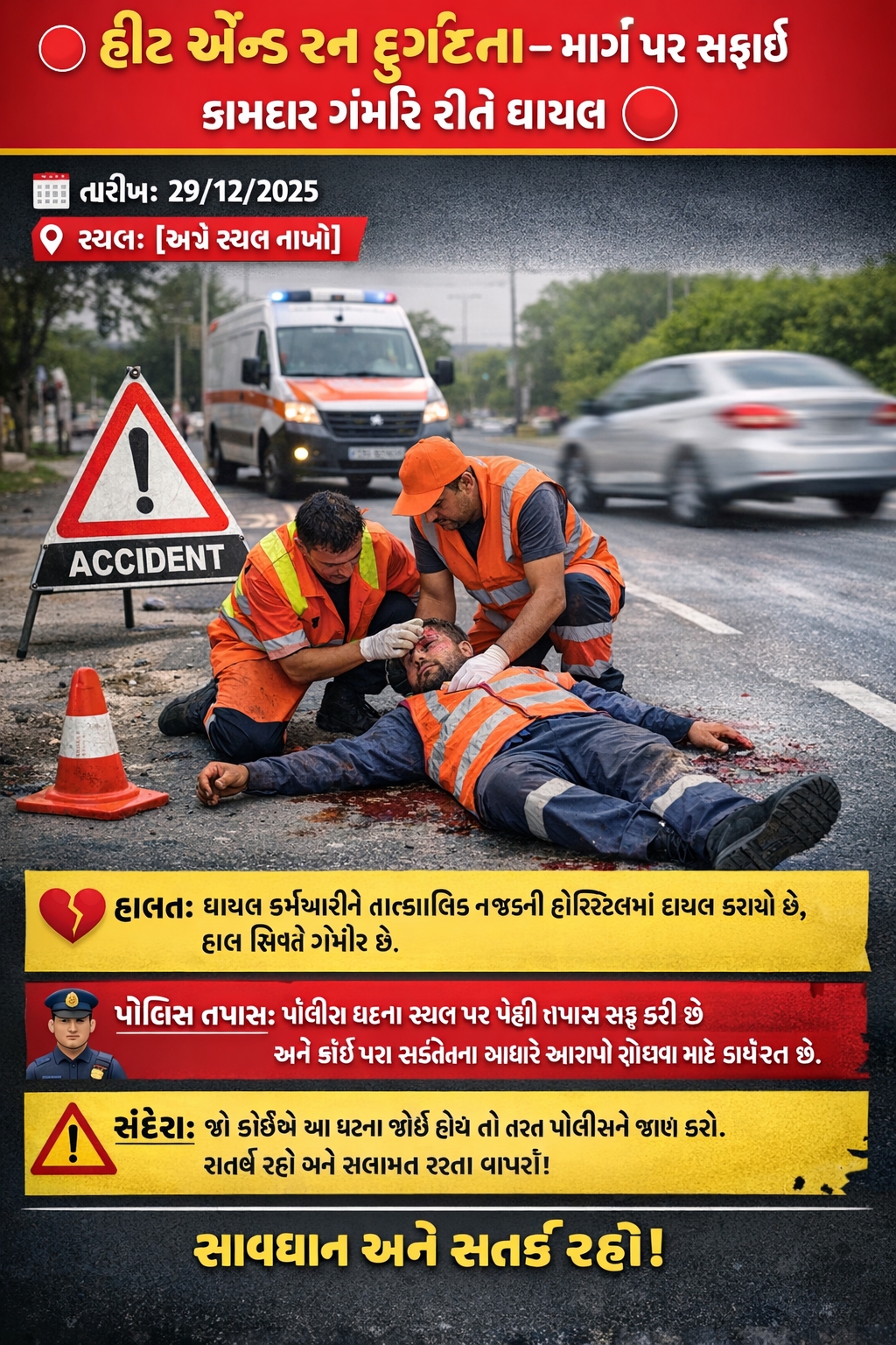 🛑 हीट एंड रन दुर्घटना – सड़क पर सफाई कर्मी गंभीर रूप से घायल 🛑
