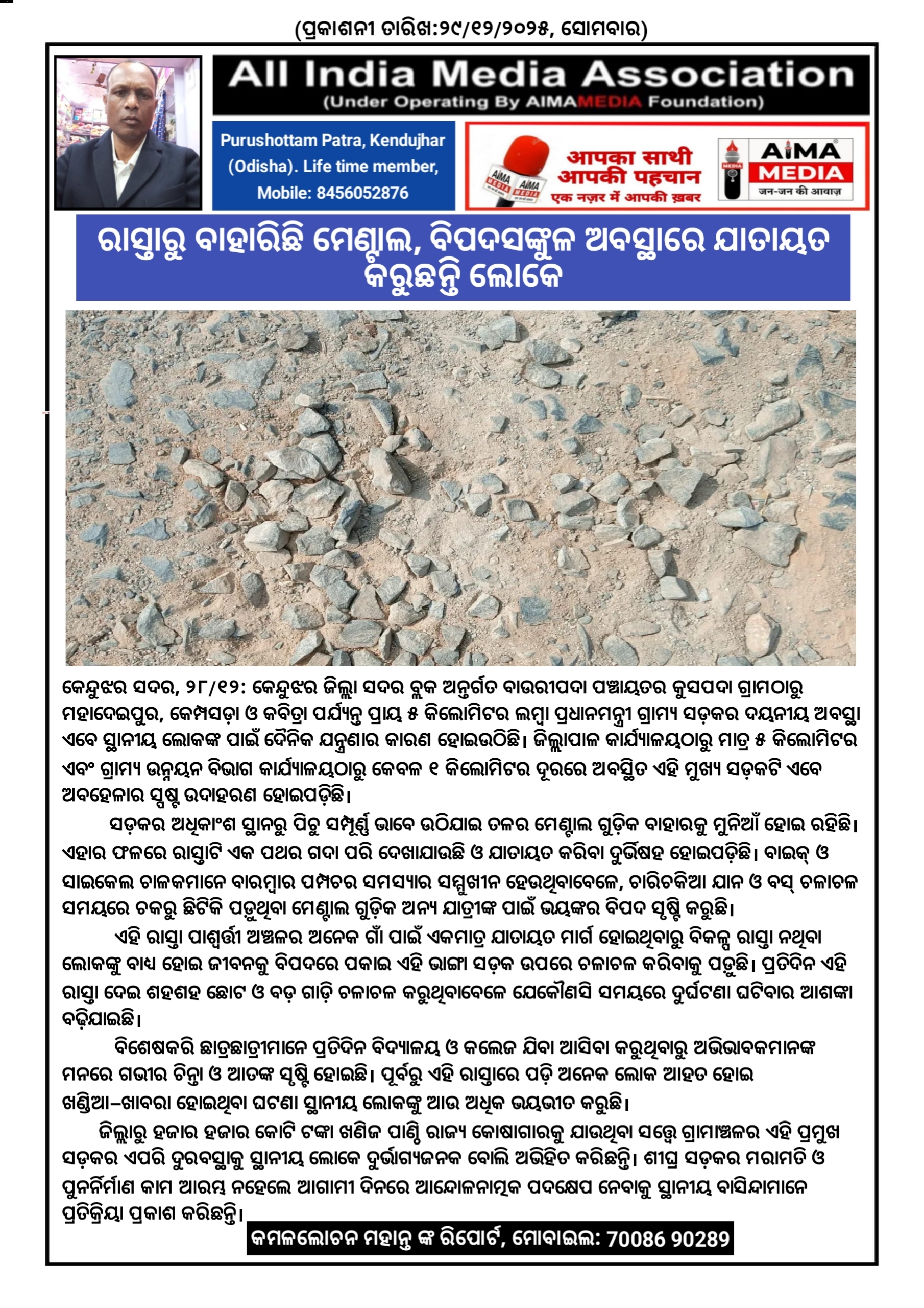 କେନ୍ଦୁଝର ସଦର, ୨୮/୧୨: କେନ୍ଦୁଝର ଜିଲ୍ଲା ସଦର ବ୍ଲକ ଅନ୍ତର୍ଗତ ବାଉରୀପଦା ପଞ୍ଚାୟତର କୁସପଦା ଗ୍ରାମଠାରୁ ମହାଦେଇପୁର, କେମ୍ପସଡ଼ା ଓ କବିତ୍ରା ପର୍ଯ୍ୟନ୍ତ ପ୍ରାୟ ୫ କିଲୋମିଟର ଲମ୍ବା ପ୍ରଧାନମନ୍ତ୍ରୀ ଗ୍ରାମ୍ୟ ସଡ଼କର ଦୟନୀୟ ଅବସ୍ଥା ଏବେ ସ୍ଥାନୀୟ ଲୋକଙ୍କ ପାଇଁ ଦୈନିକ ଯନ୍ତ୍ରଣାର କାରଣ ହୋଇଉଠିଛି। ଜିଲ୍ଲାପାଳ କାର୍ଯ୍ୟାଳୟଠାରୁ ମାତ୍ର ୫ କିଲୋମିଟର ଏବଂ ଗ୍ରାମ୍ୟ ଉନ୍ନୟନ ବିଭାଗ କାର୍ଯ୍ୟାଳୟଠାରୁ କେବଳ ୧ କିଲୋମିଟର ଦୂରରେ ଅବସ୍ଥିତ ଏହି ମୁଖ୍ୟ ସଡ଼କଟି ଏବେ ଅବହେଳାର ସ୍ପଷ୍ଟ ଉଦାହରଣ ହୋଇପଡ଼ିଛି।