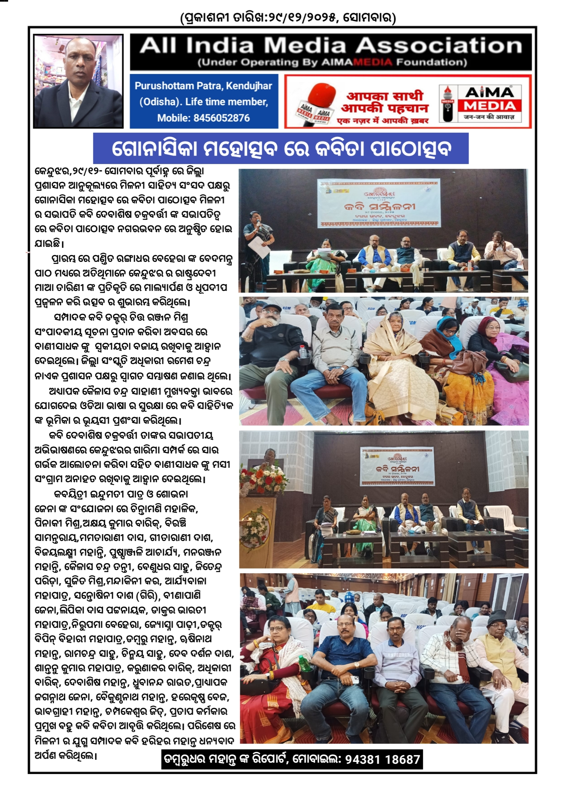 କେନ୍ଦୁଝର ତା ୨୯/୧୨- ସୋମବାର ପୂର୍ବାହ୍ନ ରେ ଜିଲ୍ଲା ପ୍ରଶାସନ ଆନୁକୂଲ୍ୟରେ ମିଳନୀ ସାହିତ୍ୟ ସଂସଦ ପକ୍ଷରୁ ଗୋନାସିକା ମହୋତ୍ସବ ରେ କବିତା ପାଠୋତ୍ସବ ମିଳନୀ ର ସଭାପତି କବି ଦେବାଶିଷ ଚକ୍ରବର୍ତ୍ତୀ ଙ୍କ ସଭାପତିତ୍ବ ରେ କବିତା ପାଠୋତ୍ସବ ନଗରଭବନ ରେ ଅନୁଷ୍ଠିତ ହୋଇ ଯାଇଛି।