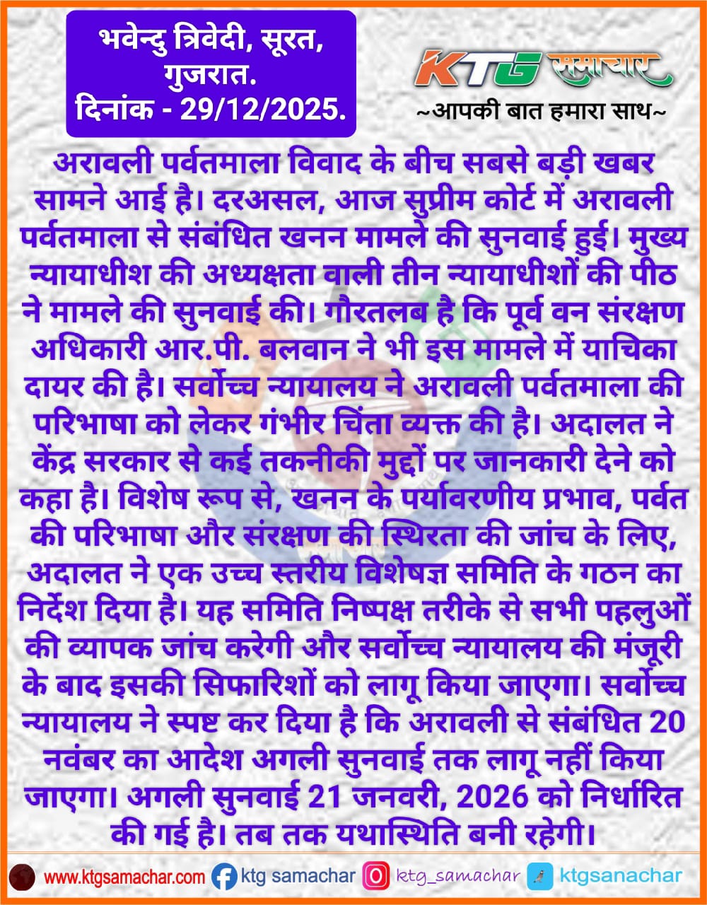 आज सुप्रीम कोर्ट में अरावली पर्वतमाला से संबंधित खनन मामले की सुनवाई हुई।
