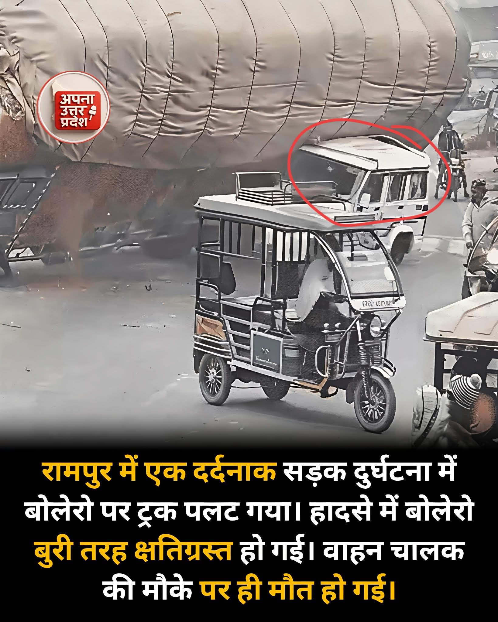 रामपुर में एक भीषण सड़क हादसे ने इलाके में हड़कंप मचा दिया। लकड़ी के बुरादे से भरा एक ट्रक अनियंत्रित होकर पहले डिवाइडर से टकराया और फिर पास से गुजर रही बोलेरो पर पलट गया। हादसे में बोलेरो वाहन बुरी तरह क्षतिग्रस्त हो गया। बोलेरो चालक की मौके पर ही मौत हो गई।