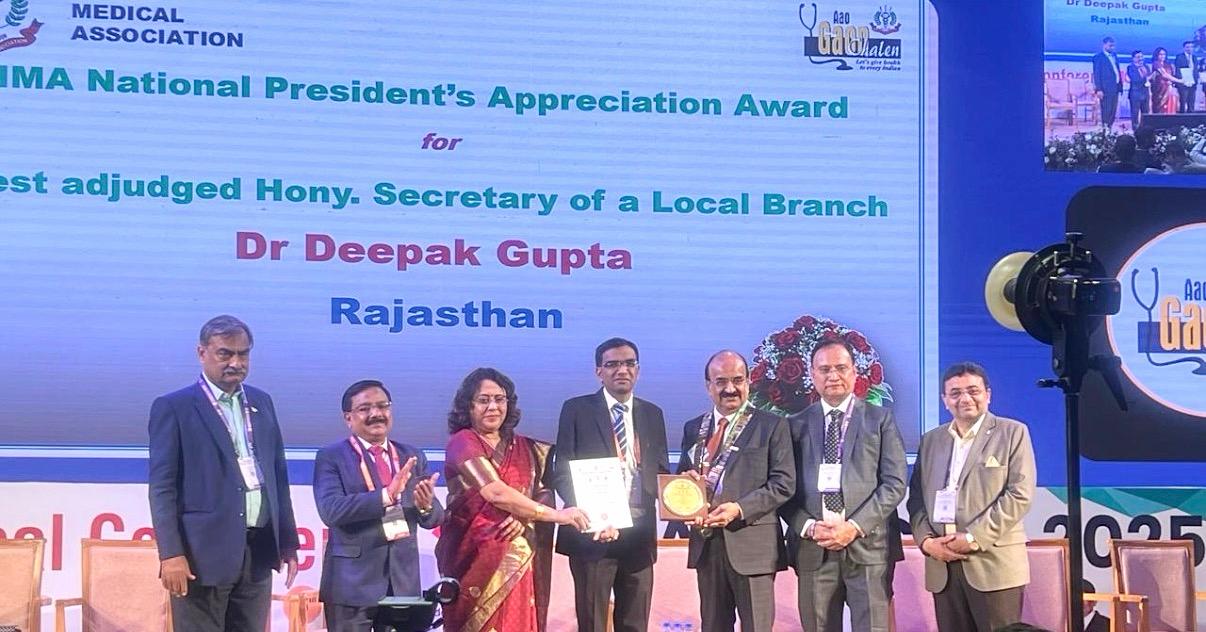 इसी अवसर पर डॉ. दीपक गुप्ता को वर्ष 2024–25 के दौरान उनके उत्कृष्ट एवं सराहनीय कार्यों के लिए आईएमए नेशनल प्रेसिडेंट्स एप्रिसिएशन अवॉर्ड (श्रेष्ठ मानद सचिव – स्थानीय शाखा) से सम्मानित किया गया। यह पुरस्कार भारतीय चिकित्सा संघ के प्रति उनके समर्पण, नेतृत्व क्षमता और संगठनात्मक योगदान के लिए दिया गया।