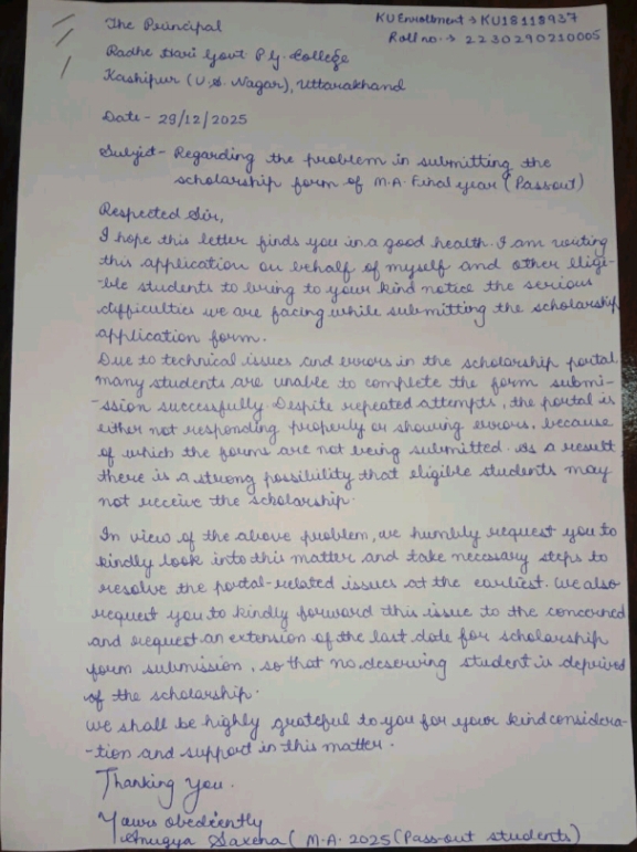 काशीपुर :-राधे हरि राजकीय विश्वविद्यालय में मुख्यमंत्री उच्च शिक्षा प्रोत्साहन छात्रवृति योजना के अंतर्गत पास आउट बच्चे 2025 26 में प्रथम द्वितीय और तृतीय हुए हैं उन्हें इस योजना का लाभ लेने के लिए दर-दर भटकना पड़ रहा है। बताया जाता है की मुख्यमंत्री उच्च शिक्षा प्रोत्साहन छात्रवृत्ति योजना वर्ष 2025 26 में पास आउट बच्चे कम उच्च शिक्षा छात्रवृत्ति पोर्टल पर आवेदन के लिए सुबह शाम 3 हफ्ते से ऑनलाइन में परेशानी आ रही है जिसके कारण बच्चे ऑनलाइन आवेदन करने में लगेहैं लेकिन नहीं हो पा रहा और कभी विश्वविद्यालय कभी प्रोफेसर कभी पोर्टल पर जा जाकर परेशान हो रहे हैं सभी पात्र छात्र-छात्राओं ने विश्वविद्यालय की प्राचार्य डॉक्टर सुमिता श्रीवास्तव वेब ऑफिसर डॉक्टर भानु प्रताप सिंह गौतम से मिलकर समस्या के समाधान को आग्रह किया जिस पर डॉक्टर भानु प्रताप सिंह गौतम ने सभी बच्चों से एक-एक प्रार्थना पत्र लिया और पीएफ भी लेकर उन्हें आश्वासन दिया कि वह देहरादून भेजकर समस्या का समाधान कराएंगे। आवेदन करने वालों में सभी पास आउट छात्र छात्राएं ने अपना अपना आवेदन विश्वविद्यालय प्रोफेसर भानु प्रताप सिंह को दे दिया।