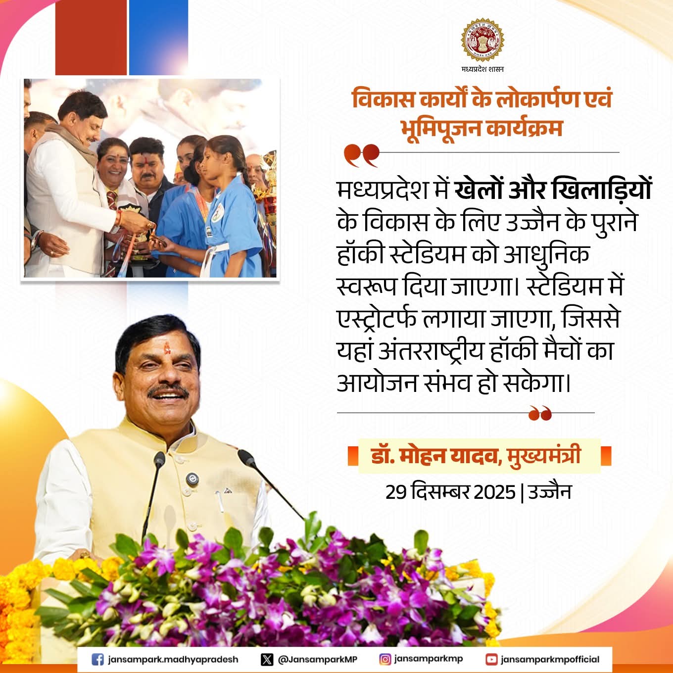 मध्यप्रदेश में खेलों और खिलाड़ियों के विकास के लिए उज्जैन के पुराने हॉकी स्टेडियम को आधुनिक स्वरूप दिया जाएगा। स्टेडियम में एस्ट्रोटर्फ लगाया जाएगा, जिससे यहां अंतरराष्ट्रीय हॉकी मैचों का आयोजन संभव हो सकेगा।