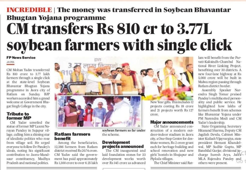 CM Dr. Mohan yadav Rs 810 cr to 3.77L soyabean farmers with single click