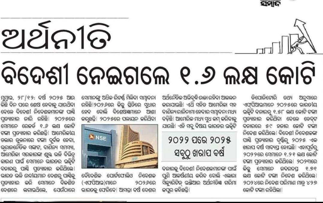 2022 ଠାରୁ 2025 ମସିହା ପଯ୍ୟନ୍ତ ଦେଶକୁ ଅର୍ଥନୀତି ଷେତ୍ରରେ ଝଟ୍କା ଲାଗିଛି। ବିଦେଶକୁ ଦାନ ସ୍ବରୂପ 1•6 ଲଷ କେ।ଟି ଟଙ୍କା ଅର୍ଥ ରାଶି ପ୍ରଦାନ କରିଛି।କିନ୍ତୁ ଏହା ପ୍ରତେକ ଭାରତୀୟକୁ ଚିନ୍ତା ର ବିଷୟ ହେଲା। 2026 ମସିହାରେ ଏହାର ସୁଧାର ଆଶିବ ବୋଲି ବିଶେଷଞ ମାନେ କହିଛନ୍ତି।