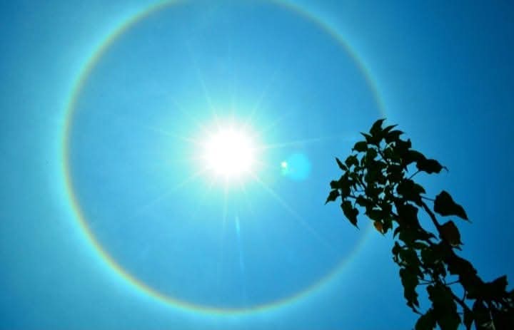 सूर्य का प्रभामंडल एक सुंदर प्रकाशीय भ्रम है, जो सूर्य के चारों ओर दिखाई देने वाला एक चमकता हुआ प्रकाश का छल्ला या वृत्त है। वैज्ञानिकों के अनुसार, यह उच्च ऊंचाई वाले सिरस बादलों में मौजूद छोटे, षट्कोणीय बर्फ के क्रिस्टलों द्वारा सूर्य के प्रकाश के अपवर्तन (मुड़ने) के कारण होता है, जो लाखों लघु प्रिज्मों की तरह काम करते हुए सफेद प्रकाश को उसके रंगों के स्पेक्ट्रम में विभाजित करते हैं, और अक्सर एक चमकदार सफेद या हल्के रंग के छल्ले के रूप में दिखाई देते हैं। Mihir Ranjan Photography https://www.dreamstime.com/mihirfoto_info