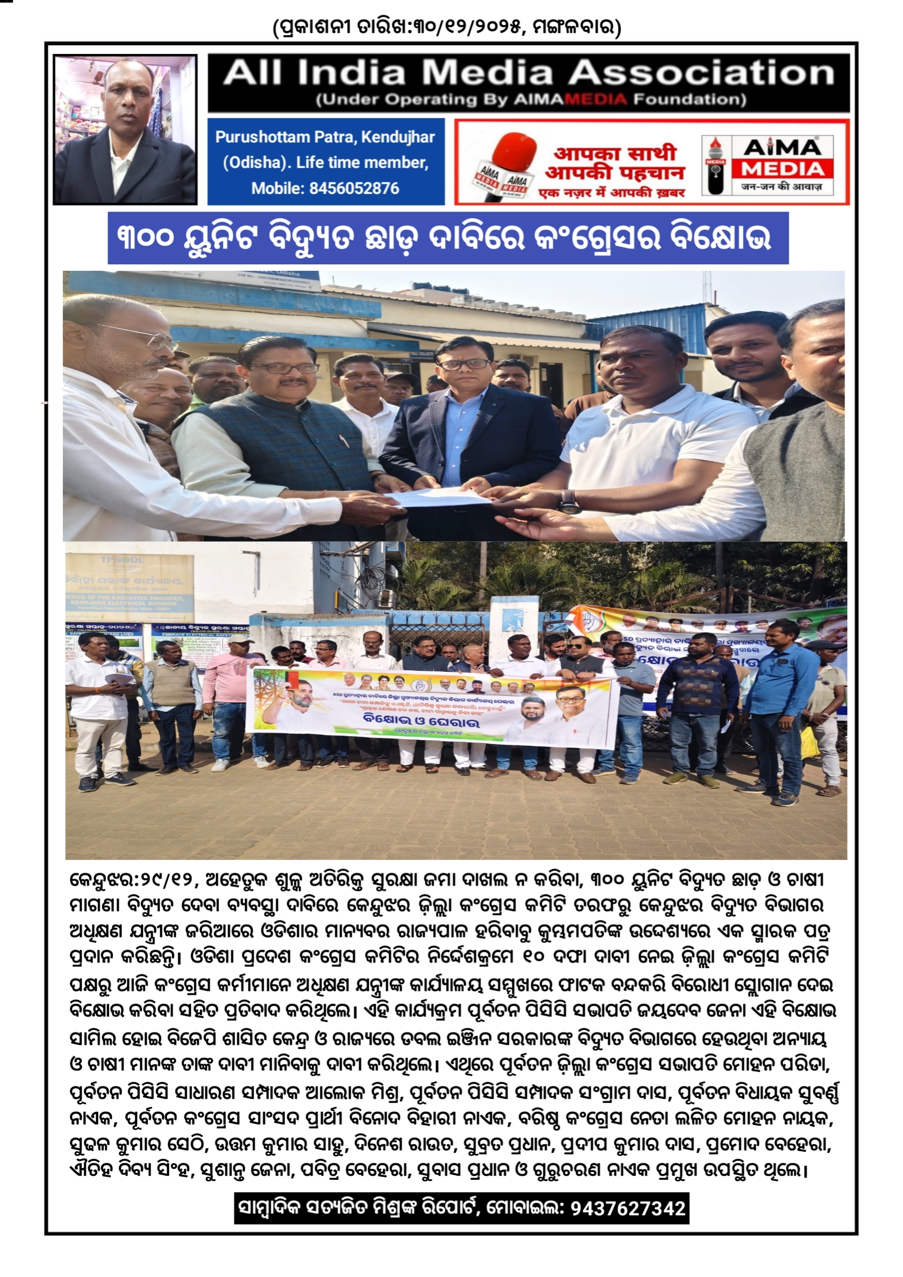 କେନ୍ଦୁଝର : ଅହେତୁକ ଶୁଳ୍କ ଅତିରିକ୍ତ ସୁରକ୍ଷା ଜମା ଦାଖଲ ନ କରିବା, ୩୦୦ ୟୁନିଟ ବିଦ୍ୟୁତ ଛାଡ଼ ଓ ଚାଷୀ ମାଗଣା ବିଦ୍ୟୁତ ଦେବା ବ୍ୟବସ୍ଥା ଦାବିରେ କେନ୍ଦୁଝର ଜ଼ିଲ୍ଲା କଂଗ୍ରେସ କମିଟି ତରଫରୁ କେନ୍ଦୁଝର ବିଦ୍ୟୁତ ବିଭାଗର ଅଧିକ୍ଷଣ ଯନ୍ତ୍ରୀଙ୍କ ଜରିଆରେ ଓଡିଶାର ମାନ୍ୟବର ରାଜ୍ୟପାଳ ହରିବାବୁ କୁମ୍ଭମପତିଙ୍କ ଉଦ୍ଦେଶ୍ୟରେ ଏକ ସ୍ମାରକ ପତ୍ର ପ୍ରଦାନ କରିଛନ୍ତି l ଓଡିଶା ପ୍ରଦେଶ କଂଗ୍ରେସ କମିଟିର ନିର୍ଦ୍ଦେଶକ୍ରମେ ୧୦ ଦଫା ଦାବୀ ନେଇ ଜ଼ିଲ୍ଲା କଂଗ୍ରେସ କମିଟି ପକ୍ଷରୁ ଆଜି କଂଗ୍ରେସ କର୍ମୀମାନେ ଅଧିକ୍ଷଣ ଯନ୍ତ୍ରୀଙ୍କ କାର୍ଯ୍ୟାଳୟ ସମ୍ମୁଖରେ ଫାଟକ ବନ୍ଦକରି ବିରୋଧୀ ସ୍ଲୋଗାନ ଦେଇ ବିକ୍ଷୋଭ କରିବା ସହିତ ପ୍ରତିବାଦ କରିଥିଲେ l ଏହି କାର୍ଯ୍ୟକ୍ରମ ପୂର୍ବତନ ପିସିସି ସଭାପତି ଜୟଦେବ ଜେନା ଏହି ବିକ୍ଷୋଭ ସାମିଲ ହୋଇ ବିଜେପି ଶାସିତ କେନ୍ଦ୍ର ଓ ରାଜ୍ୟରେ ଡବଲ ଇଞ୍ଜିନ ସରକାରଙ୍କ ବିଦ୍ୟୁତ ବିଭାଗରେ ହେଉଥିବା ଅନ୍ୟାୟ ଓ ଚାଷୀ ମାନଙ୍କ ତାଙ୍କ ଦାବୀ ମାନିବାକୁ ଦାବୀ କରିଥିଲେ l ଏଥିରେ ପୂର୍ବତନ ଜ଼ିଲ୍ଲା କଂଗ୍ରେସ ସଭାପତି ମୋହନ ପରିଡା, ପୂର୍ବତନ ପିସିସି ସାଧାରଣ ସମ୍ପାଦକ ଆଲୋକ ମିଶ୍ର, ପୂର୍ବତନ ପିସିସି ସମ୍ପାଦକ ସଂଗ୍ରାମ ଦାସ, ପୂର୍ବତନ ବିଧାୟକ ସୁବର୍ଣ୍ଣ ନାଏକ, ପୂର୍ବତନ କଂଗ୍ରେସ ସାଂସଦ ପ୍ରାର୍ଥୀ ବିନୋଦ ବିହାରୀ ନାଏକ, ବରିଷ୍ଠ କଂଗ୍ରେସ ନେତା ଲଳିତ ମୋହନ ନାୟକ, ସୁଢଳ କୁମାର ସେଠି, ଉତ୍ତମ କୁମାର ସାହୁ, ଦିନେଶ ରାଉତ, ସୁବ୍ରତ ପ୍ରଧାନ, ପ୍ରଦୀପ କୁମାର ଦାସ, ପ୍ରମୋଦ ବେହେରା, ଐତିହ ଦିବ୍ୟ ସିଂହ, ସୁଶାନ୍ତ ଜେନା, ପବିତ୍ର ବେହେରା, ସୁବାସ ପ୍ରଧାନ ଓ ଗୁରୁଚରଣ ନାଏକ ପ୍ରମୁଖ ଉପସ୍ଥିତ ଥିଲେ l