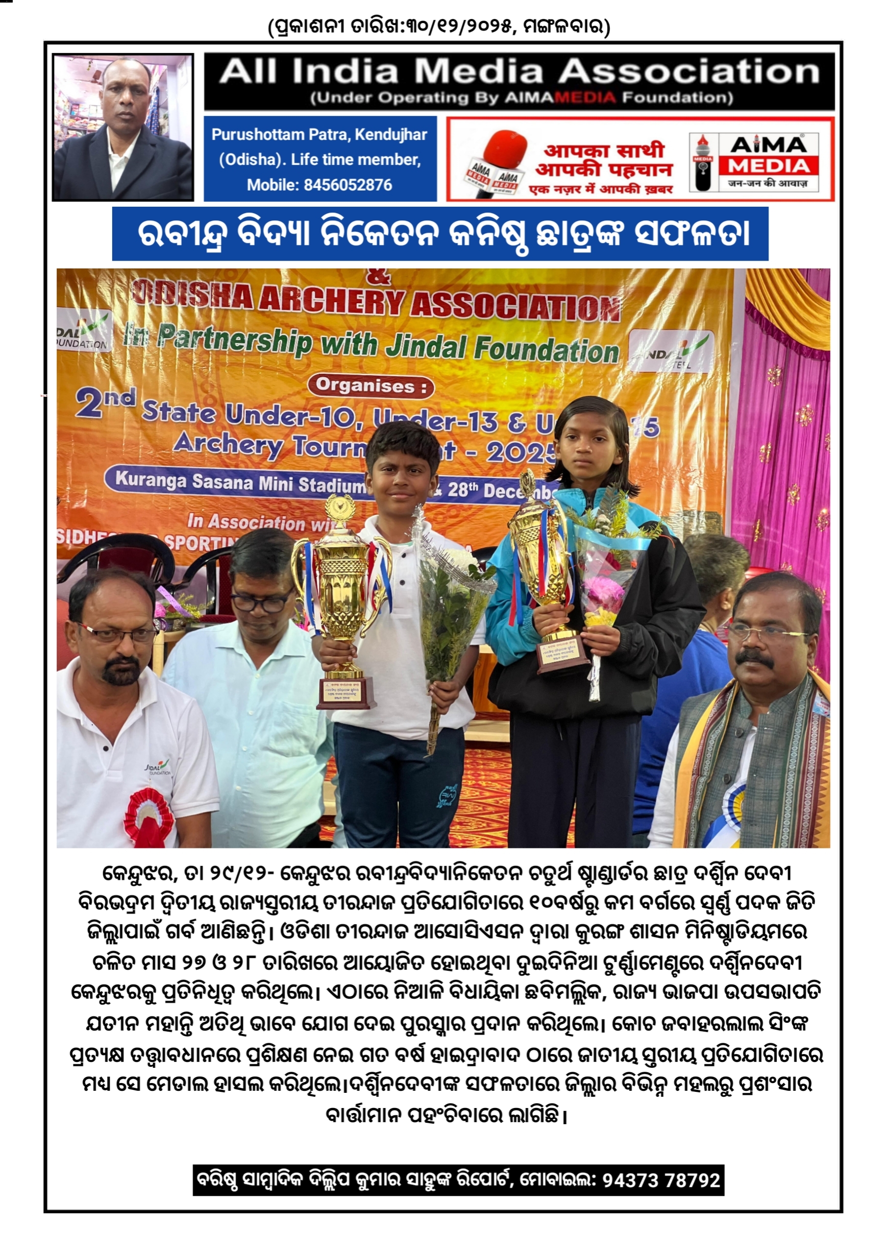 କେନ୍ଦୁଝର,ତା ୨୯/୧୨- କେନ୍ଦୁଝର ରବୀନ୍ଦ୍ରବିଦ୍ୟାନିକେତନ ଚତୁର୍ଥ ଷ୍ଟାଣ୍ଡାର୍ଡର ଛାତ୍ର ଦର୍ଶ୍ଵିନ ଦେବୀ ବିରଭଦ୍ରମ ଦ୍ଵିତୀୟ ରାଜ୍ୟସ୍ତରୀୟ ତୀରନ୍ଦାଜ ପ୍ରତିଯୋଗିତାରେ ୧୦ବର୍ଷରୁ କମ ବର୍ଗରେ ସ୍ୱର୍ଣ୍ଣ ପଦକ ଜିତି ଜିଲ୍ଲାପାଇଁ ଗର୍ବ ଆଣିଛନ୍ତି। ଓଡିଶା ତୀରନ୍ଦାଜ ଆସୋସିଏସନ ଦ୍ୱାରା କୁରଙ୍ଗ ଶାସନ ମିନିଷ୍ଟାଡିୟମରେ ଚଳିତ ମାସ ୨୭ ଓ ୨୮ ତାରିଖରେ ଆୟୋଜିତ ହୋଇଥିବା ଦୁଇଦିନିଆ ଟୁର୍ଣ୍ଣାମେଣ୍ଟରେ ଦର୍ଶ୍ଵିନଦେବୀ କେନ୍ଦୁଝରକୁ ପ୍ରତିନିଧିତ୍ୱ କରିଥିଲେ। ଏଠାରେ ନିଆଳି ବିଧାୟିକା ଛବିମଲ୍ଲିକ, ରାଜ୍ୟ ଭାଜପା ଉପସଭାପତି ଯତୀନ ମହାନ୍ତି ଅତିଥି ଭାବେ ଯୋଗ ଦେଇ ପୁରସ୍କାର ପ୍ରଦାନ କରିଥିଲେ। କୋଚ ଜବାହରଲାଲ ସିଂଙ୍କ ପ୍ରତ୍ୟକ୍ଷ ତତ୍ତ୍ଵାବଧାନରେ ପ୍ରଶିକ୍ଷଣ ନେଇ ଗତ ବର୍ଷ ହାଇଦ୍ରାବାଦ ଠାରେ ଜାତୀୟ ସ୍ତରୀୟ ପ୍ରତିଯୋଗିତାରେ ମଧ୍ୟ ସେ ମେଡାଲ ହାସଲ କରିଥିଲେ।ଦର୍ଶ୍ଵିନଦେବୀଙ୍କ ସଫଳତାରେ ଜିଲ୍ଲାର ବିଭିନ୍ନ ମହଲରୁ ପ୍ରଶଂସାର ବାର୍ତ୍ତାମାନ ପହଂଚିବାରେ ଲାଗିଛି।