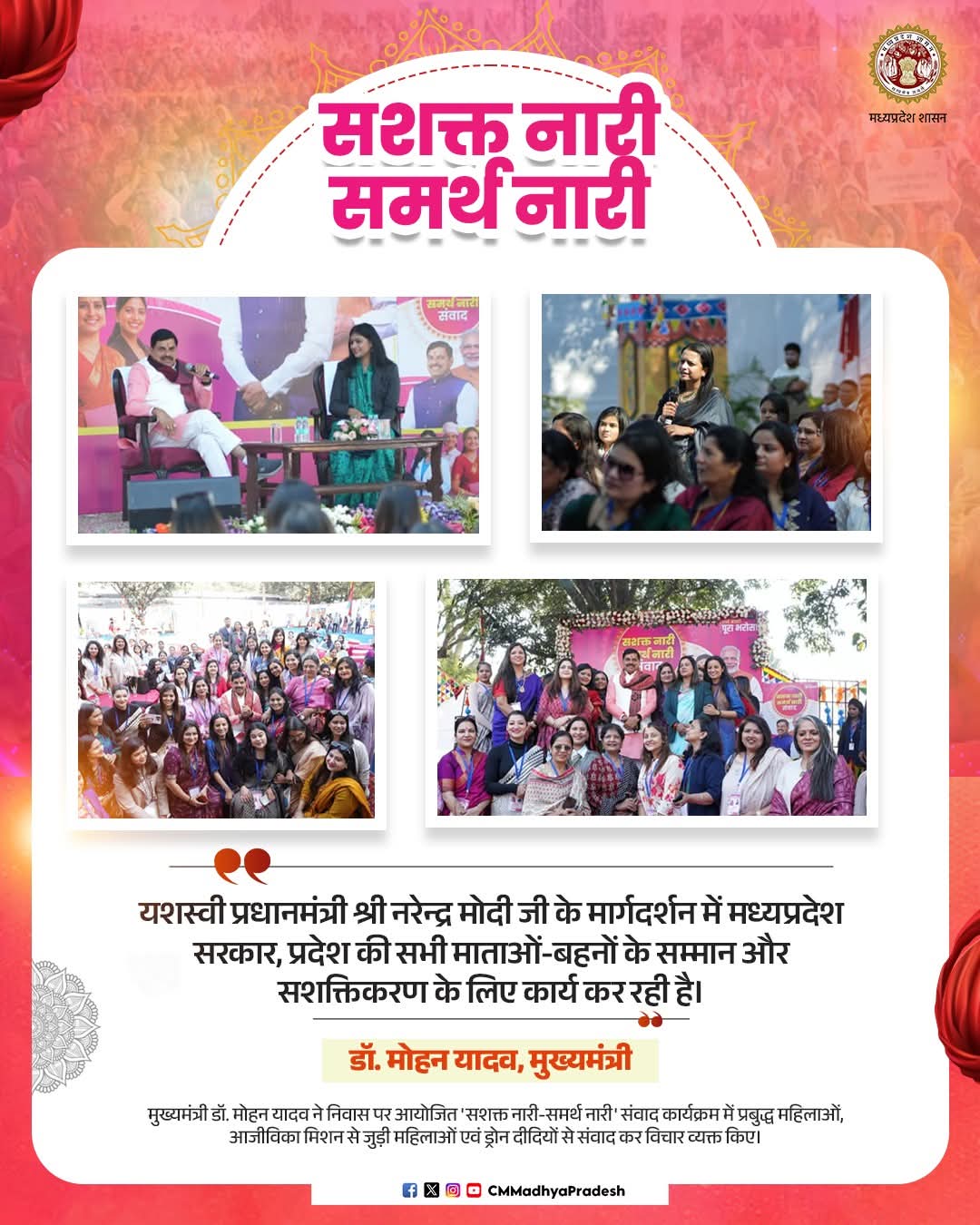 मुख्यमंत्री डॉ. मोहन यादव ने निवास पर आयोजित 'सशक्त नारी-समर्थ नारी' संवाद कार्यक्रम में प्रबुद्ध महिलाओं, आजीविका मिशन से जुड़ी महिलाओं एवं ड्रोन दीदियों से संवाद कर विचार व्यक्त किए।