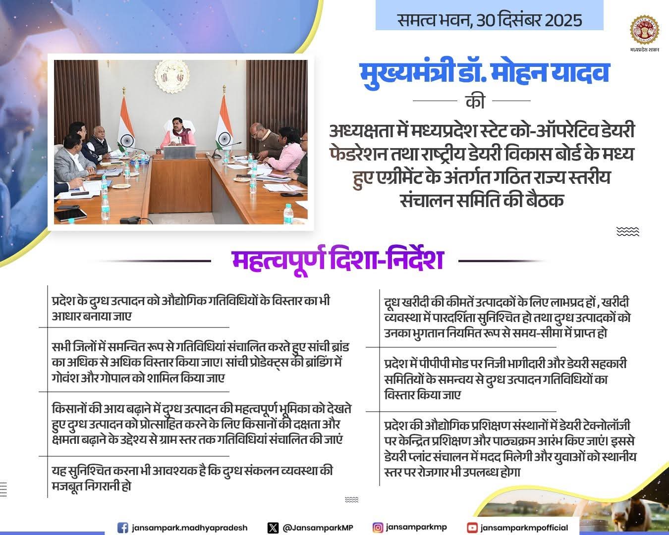 मुख्यमंत्री डॉ. मोहन यादव की अध्यक्षता में मध्यप्रदेश स्टेट को-ऑपरेटिव डेयरी फेडरेशन तथा राष्ट्रीय डेयरी विकास बोर्ड के मध्य हुए एग्रीमेंट के अंतर्गत गठित राज्य स्तरीय संचालन समिति की बैठक