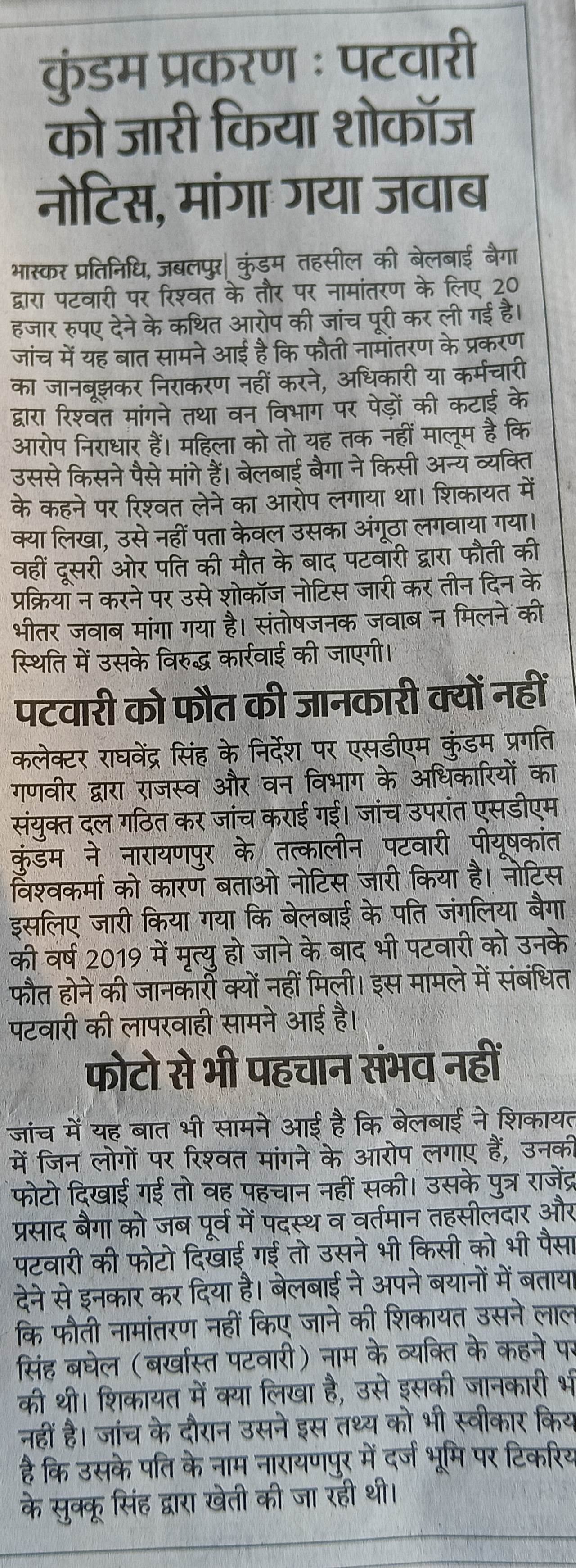 कुंडम प्रकरण पटवारी को जारी किया शोकाज नोटिस मांगा गया जवाब